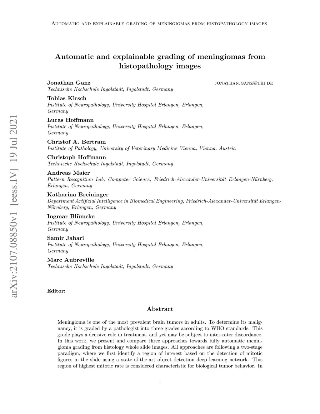 Meningioma is one of the most prevalent brain tumors in adults. To determine its malignancy, it is graded by a pathologist into three grades according to WHO standards. This grade plays a decisive role in treatment, and yet may be subject to inter-rater discordance. In this work, we present and compare three approaches towards fully automatic meningioma grading from histology whole slide images. All approaches are following a two-stage paradigm, where we first identify a region of interest based on the detection of mitotic figures in the slide using a state-of-the-art object detection deep learning network. This region of highest mitotic rate is considered characteristic for biological tumor behavior. In the second stage, we calculate a score corresponding to tumor malignancy based on information contained in this region using three different settings. In a first approach, image patches are sampled from this region and regression is based on morphological features encoded by a ResNet-based network. We compare this to learning a logistic regression from the determined mitotic count, an approach which is easily traceable and explainable. Lastly, we combine both approaches in a single network. We trained the pipeline on 951 slides from 341 patients and evaluated them on a separate set of 141 slides from 43 patients. All approaches yield a high correlation to the WHO grade. The logistic regression and the combined approach had the best results in our experiments, yielding correct predictions in 32 and 33 of all cases, respectively, with the image-based approach only predicting 25 cases correctly. Spearman's correlation was 0.716, 0.792 and 0.790 respectively. It may seem counterintuitive at first that morphological features provided by image patches do not improve model performance. Yet, this mirrors the criteria of the grading scheme, where mitotic count is the only unequivocal parameter.