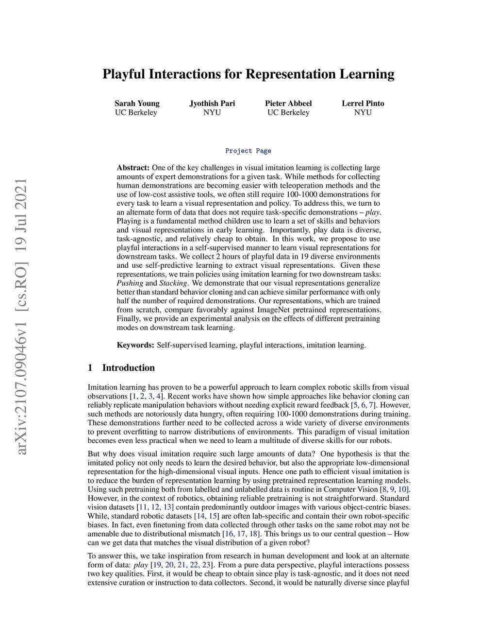 One of the key challenges in visual imitation learning is collecting large amounts of expert demonstrations for a given task. While methods for collecting human demonstrations are becoming easier with teleoperation methods and the use of low-cost assistive tools, we often still require 100-1000 demonstrations for every task to learn a visual representation and policy. To address this, we turn to an alternate form of data that does not require task-specific demonstrations -- play. Playing is a fundamental method children use to learn a set of skills and behaviors and visual representations in early learning. Importantly, play data is diverse, task-agnostic, and relatively cheap to obtain. In this work, we propose to use playful interactions in a self-supervised manner to learn visual representations for downstream tasks. We collect 2 hours of playful data in 19 diverse environments and use self-predictive learning to extract visual representations. Given these representations, we train policies using imitation learning for two downstream tasks: Pushing and Stacking. We demonstrate that our visual representations generalize better than standard behavior cloning and can achieve similar performance with only half the number of required demonstrations. Our representations, which are trained from scratch, compare favorably against ImageNet pretrained representations. Finally, we provide an experimental analysis on the effects of different pretraining modes on downstream task learning.