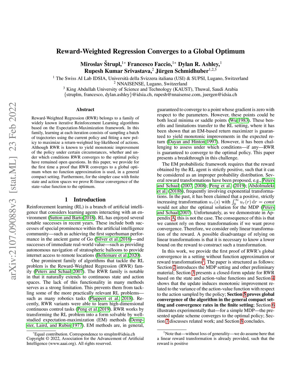 Reward-Weighted Regression (RWR) belongs to a family of widely known iterative Reinforcement Learning algorithms based on the Expectation-Maximization framework. In this family, learning at each iteration consists of sampling a batch of trajectories using the current policy and fitting a new policy to maximize a return-weighted log-likelihood of actions. Although RWR is known to yield monotonic improvement of the policy under certain circumstances, whether and under which conditions RWR converges to the optimal policy have remained open questions. In this paper, we provide for the first time a proof that RWR converges to a global optimum when no function approximation is used, in a general compact setting. Furthermore, for the simpler case with finite state and action spaces we prove R-linear convergence of the state-value function to the optimum.