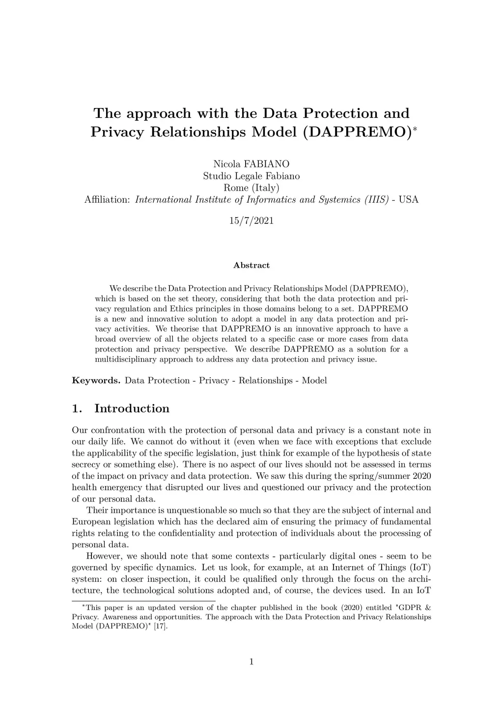 We describe the Data Protection and Privacy Relationships Model (DAPPREMO), which is based on the set theory, considering that both the data protection and privacy regulation and Ethics principles in those domains belong to a set. DAPPREMO is a new and innovative solution to adopt a model in any data protection and privacy activities. We theorise that DAPPREMO is an innovative approach to have a broad overview of all the objects related to a specific case or more cases from data protection and privacy perspective. We describe DAPPREMO as a solution for a multidisciplinary approach to address any data protection and privacy issue.