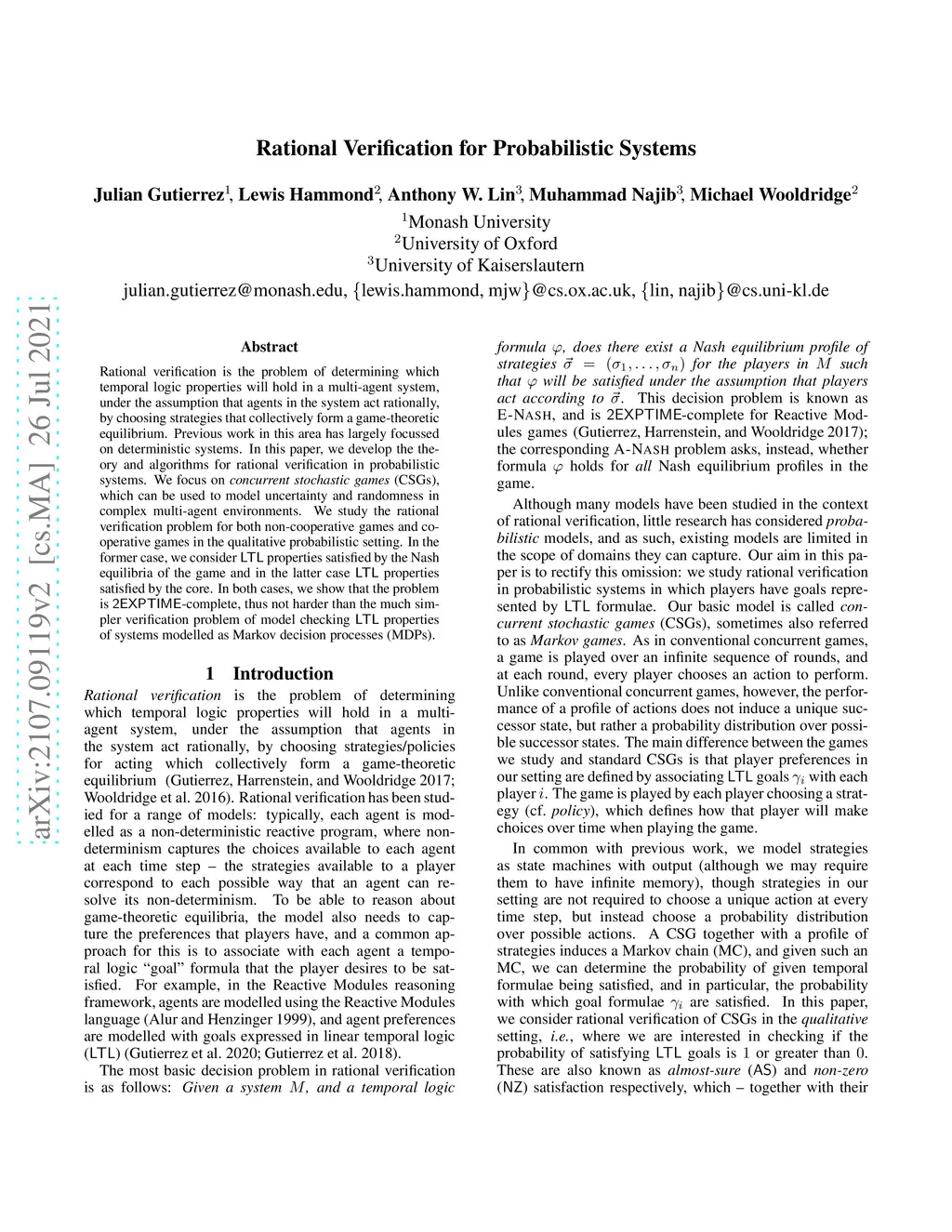 Rational verification is the problem of determining which temporal logic properties will hold in a multi-agent system, under the assumption that agents in the system act rationally, by choosing strategies that collectively form a game-theoretic equilibrium. Previous work in this area has largely focussed on deterministic systems. In this paper, we develop the theory and algorithms for rational verification in probabilistic systems. We focus on concurrent stochastic games (CSGs), which can be used to model uncertainty and randomness in complex multi-agent environments. We study the rational verification problem for both non-cooperative games and cooperative games in the qualitative probabilistic setting. In the former case, we consider LTL properties satisfied by the Nash equilibria of the game and in the latter case LTL properties satisfied by the core. In both cases, we show that the problem is 2EXPTIME-complete, thus not harder than the much simpler verification problem of model checking LTL properties of systems modelled as Markov decision processes (MDPs).