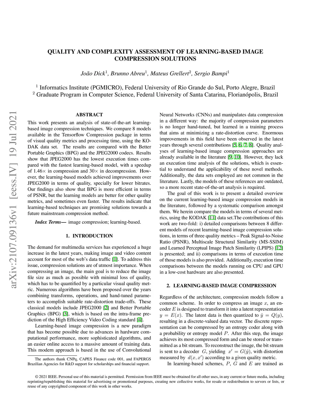 This work presents an analysis of state-of-the-art learning-based image compression techniques. We compare 8 models available in the Tensorflow Compression package in terms of visual quality metrics and processing time, using the KODAK data set. The results are compared with the Better Portable Graphics (BPG) and the JPEG2000 codecs. Results show that JPEG2000 has the lowest execution times compared with the fastest learning-based model, with a speedup of 1.46x in compression and 30x in decompression. However, the learning-based models achieved improvements over JPEG2000 in terms of quality, specially for lower bitrates. Our findings also show that BPG is more efficient in terms of PSNR, but the learning models are better for other quality metrics, and sometimes even faster. The results indicate that learning-based techniques are promising solutions towards a future mainstream compression method.
