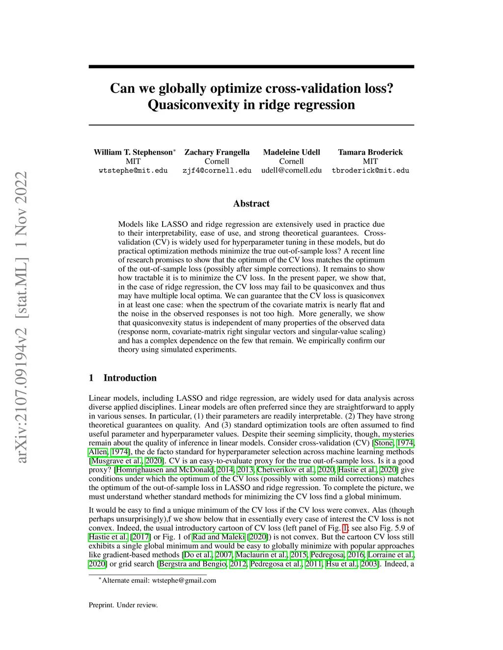 Can we globally optimize cross-validation loss? Quasiconvexity in ridge