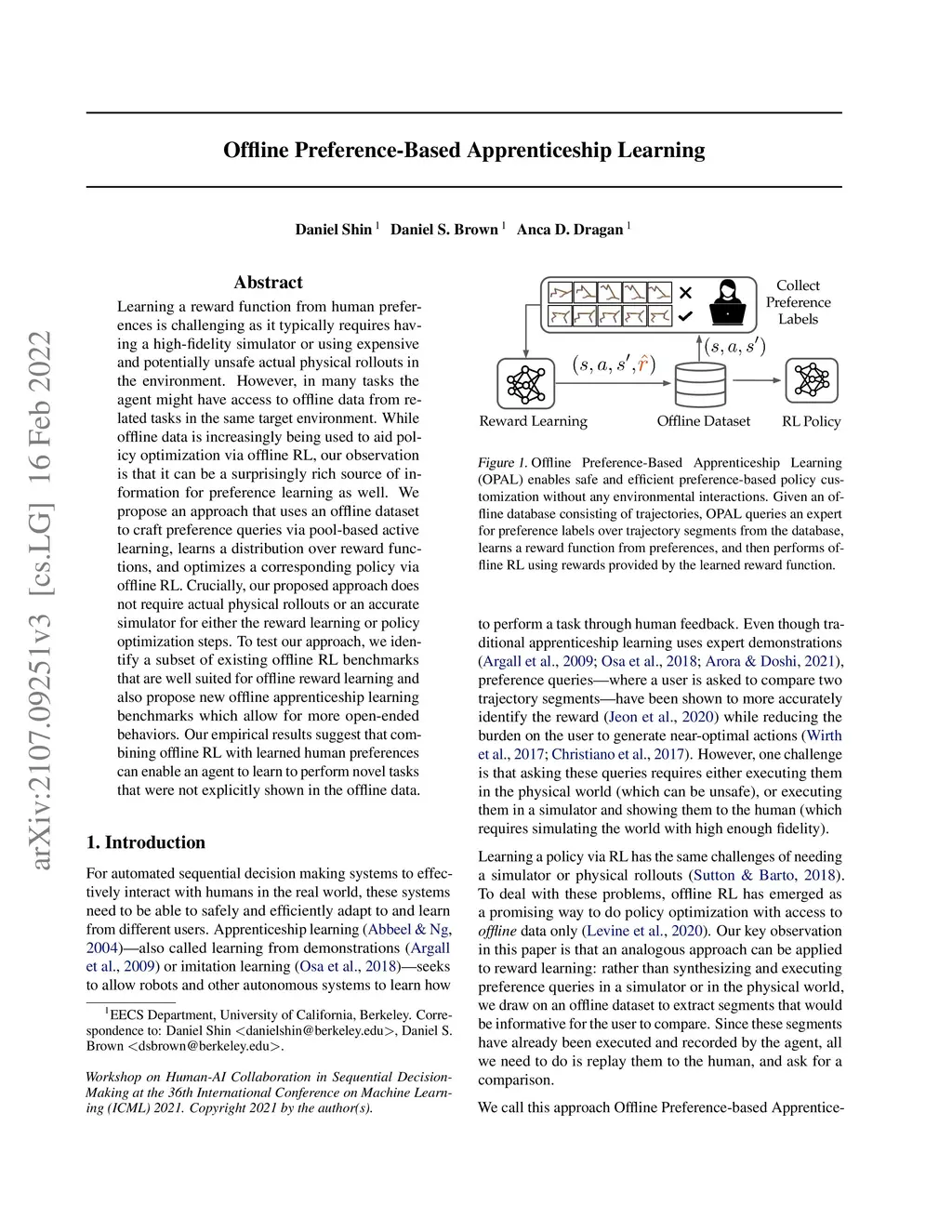 Learning a reward function from human preferences is challenging as it typically requires having a high-fidelity simulator or using expensive and potentially unsafe actual physical rollouts in the environment. However, in many tasks the agent might have access to offline data from related tasks in the same target environment. While offline data is increasingly being used to aid policy optimization via offline RL, our observation is that it can be a surprisingly rich source of information for preference learning as well. We propose an approach that uses an offline dataset to craft preference queries via pool-based active learning, learns a distribution over reward functions, and optimizes a corresponding policy via offline RL. Crucially, our proposed approach does not require actual physical rollouts or an accurate simulator for either the reward learning or policy optimization steps. To test our approach, we identify a subset of existing offline RL benchmarks that are well suited for offline reward learning and also propose new offline apprenticeship learning benchmarks which allow for more open-ended behaviors. Our empirical results suggest that combining offline RL with learned human preferences can enable an agent to learn to perform novel tasks that were not explicitly shown in the offline data.