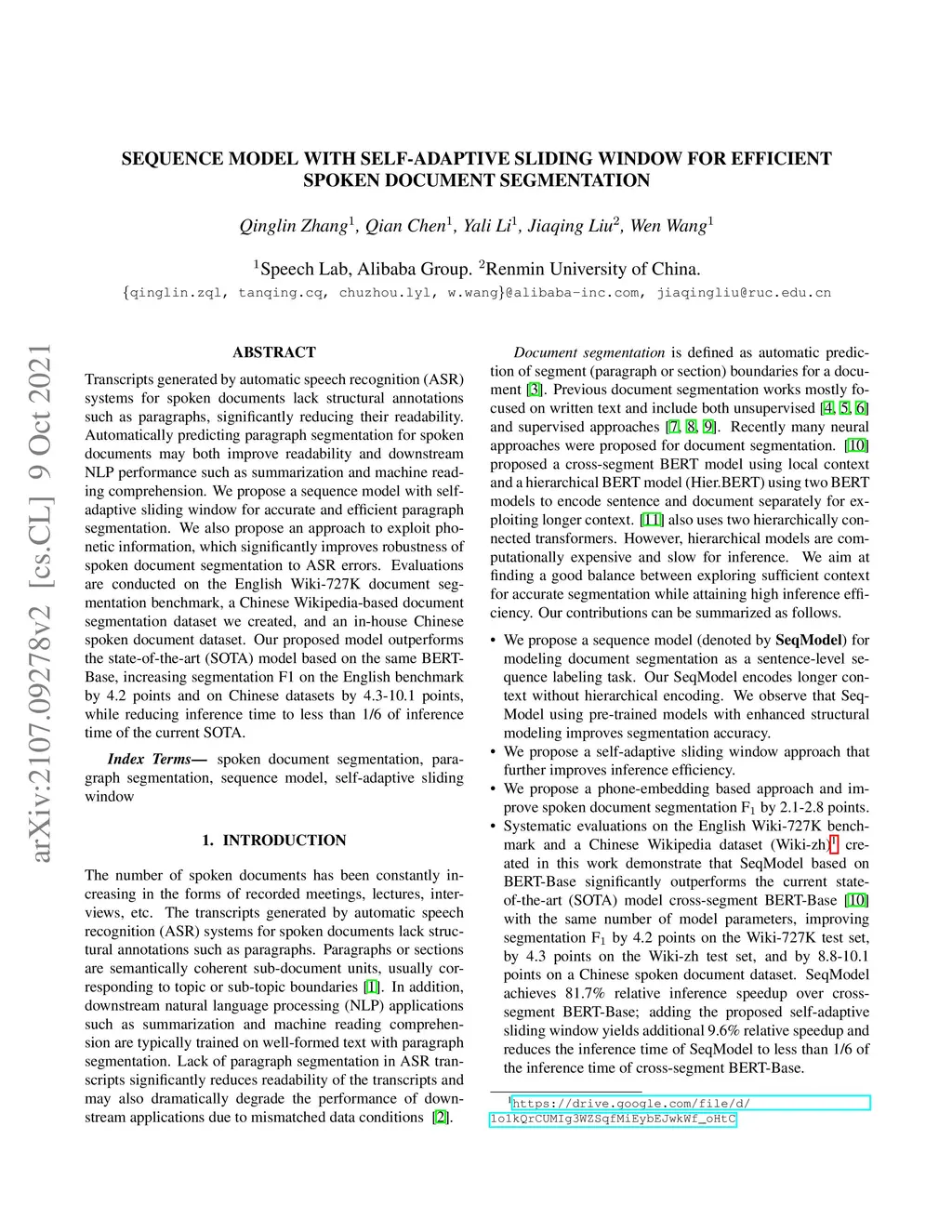 Transcripts generated by automatic speech recognition (ASR) systems for spoken documents lack structural annotations such as paragraphs, significantly reducing their readability. Automatically predicting paragraph segmentation for spoken documents may both improve readability and downstream NLP performance such as summarization and machine reading comprehension. We propose a sequence model with self-adaptive sliding window for accurate and efficient paragraph segmentation. We also propose an approach to exploit phonetic information, which significantly improves robustness of spoken document segmentation to ASR errors. Evaluations are conducted on the English Wiki-727K document segmentation benchmark, a Chinese Wikipedia-based document segmentation dataset we created, and an in-house Chinese spoken document dataset. Our proposed model outperforms the state-of-the-art (SOTA) model based on the same BERT-Base, increasing segmentation F1 on the English benchmark by 4.2 points and on Chinese datasets by 4.3-10.1 points, while reducing inference time to less than 1/6 of inference time of the current SOTA.