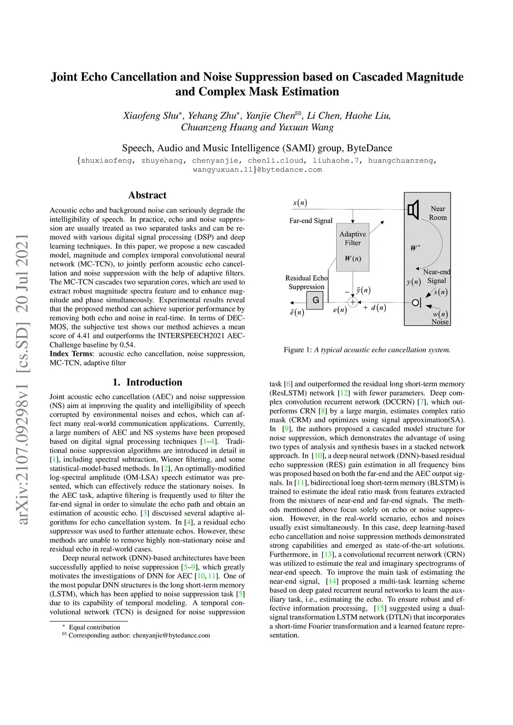 Acoustic echo and background noise can seriously degrade the intelligibility of speech. In practice, echo and noise suppression are usually treated as two separated tasks and can be removed with various digital signal processing (DSP) and deep learning techniques. In this paper, we propose a new cascaded model, magnitude and complex temporal convolutional neural network (MC-TCN), to jointly perform acoustic echo cancellation and noise suppression with the help of adaptive filters. The MC-TCN cascades two separation cores, which are used to extract robust magnitude spectra feature and to enhance magnitude and phase simultaneously. Experimental results reveal that the proposed method can achieve superior performance by removing both echo and noise in real-time. In terms of DECMOS, the subjective test shows our method achieves a mean score of 4.41 and outperforms the INTERSPEECH2021 AEC-Challenge baseline by 0.54.