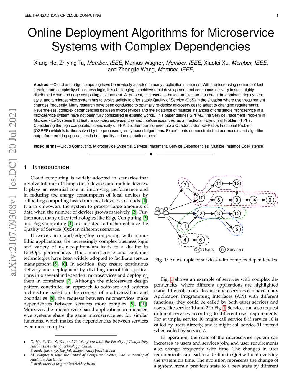 Cloud and edge computing have been widely adopted in many application scenarios. With the increasing demand of fast iteration and complexity of business logic, it is challenging to achieve rapid development and continuous delivery in such highly distributed cloud and edge computing environment. At present, microservice-based architecture has been the dominant deployment style, and a microservice system has to evolve agilely to offer stable Quality of Service (QoS) in the situation where user requirement changes frequently. Many research have been conducted to optimally re-deploy microservices to adapt to changing requirements. Nevertheless, complex dependencies between microservices and the existence of multiple instances of one single microservice in a microservice system have not been fully considered in existing works. This paper defines SPPMS, the Service Placement Problem in Microservice Systems that feature complex dependencies and multiple instances, as a Fractional Polynomial Problem (FPP) . Considering the high computation complexity of FPP, it is then transformed into a Quadratic Sum-of-Ratios Fractional Problem (QSRFP) which is further solved by the proposed greedy-based algorithms. Experiments demonstrate that our models and algorithms outperform existing approaches in both quality and computation speed.