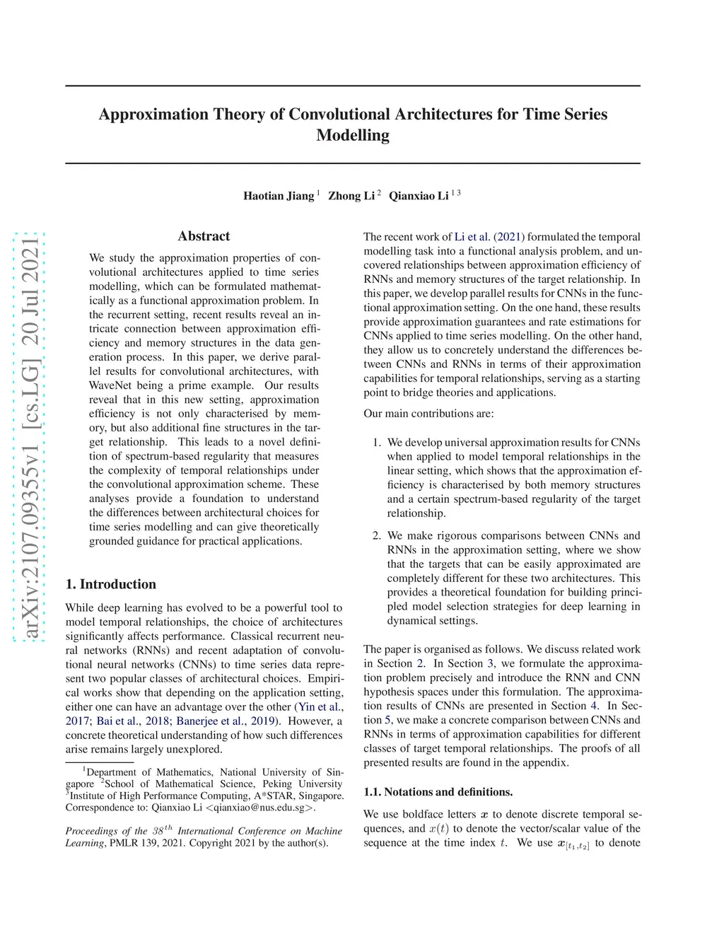 We study the approximation properties of convolutional architectures applied to time series modelling, which can be formulated mathematically as a functional approximation problem. In the recurrent setting, recent results reveal an intricate connection between approximation efficiency and memory structures in the data generation process. In this paper, we derive parallel results for convolutional architectures, with WaveNet being a prime example. Our results reveal that in this new setting, approximation efficiency is not only characterised by memory, but also additional fine structures in the target relationship. This leads to a novel definition of spectrum-based regularity that measures the complexity of temporal relationships under the convolutional approximation scheme. These analyses provide a foundation to understand the differences between architectural choices for time series modelling and can give theoretically grounded guidance for practical applications.