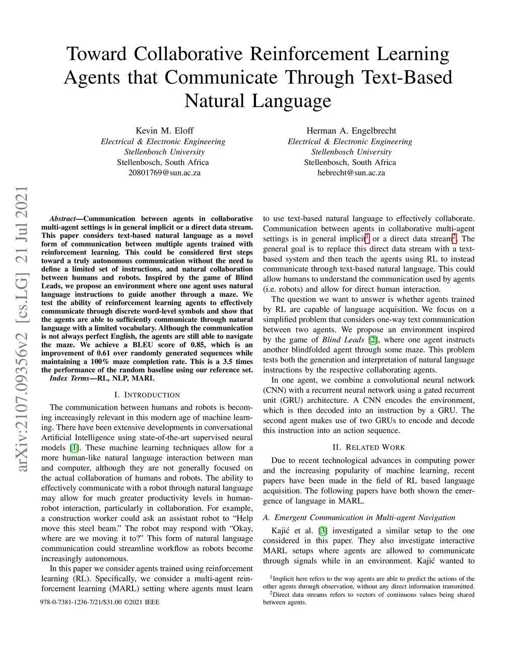 Communication between agents in collaborative multi-agent settings is in general implicit or a direct data stream. This paper considers text-based natural language as a novel form of communication between multiple agents trained with reinforcement learning. This could be considered first steps toward a truly autonomous communication without the need to define a limited set of instructions, and natural collaboration between humans and robots. Inspired by the game of Blind Leads, we propose an environment where one agent uses natural language instructions to guide another through a maze. We test the ability of reinforcement learning agents to effectively communicate through discrete word-level symbols and show that the agents are able to sufficiently communicate through natural language with a limited vocabulary. Although the communication is not always perfect English, the agents are still able to navigate the maze. We achieve a BLEU score of 0.85, which is an improvement of 0.61 over randomly generated sequences while maintaining a 100% maze completion rate. This is a 3.5 times the performance of the random baseline using our reference set.