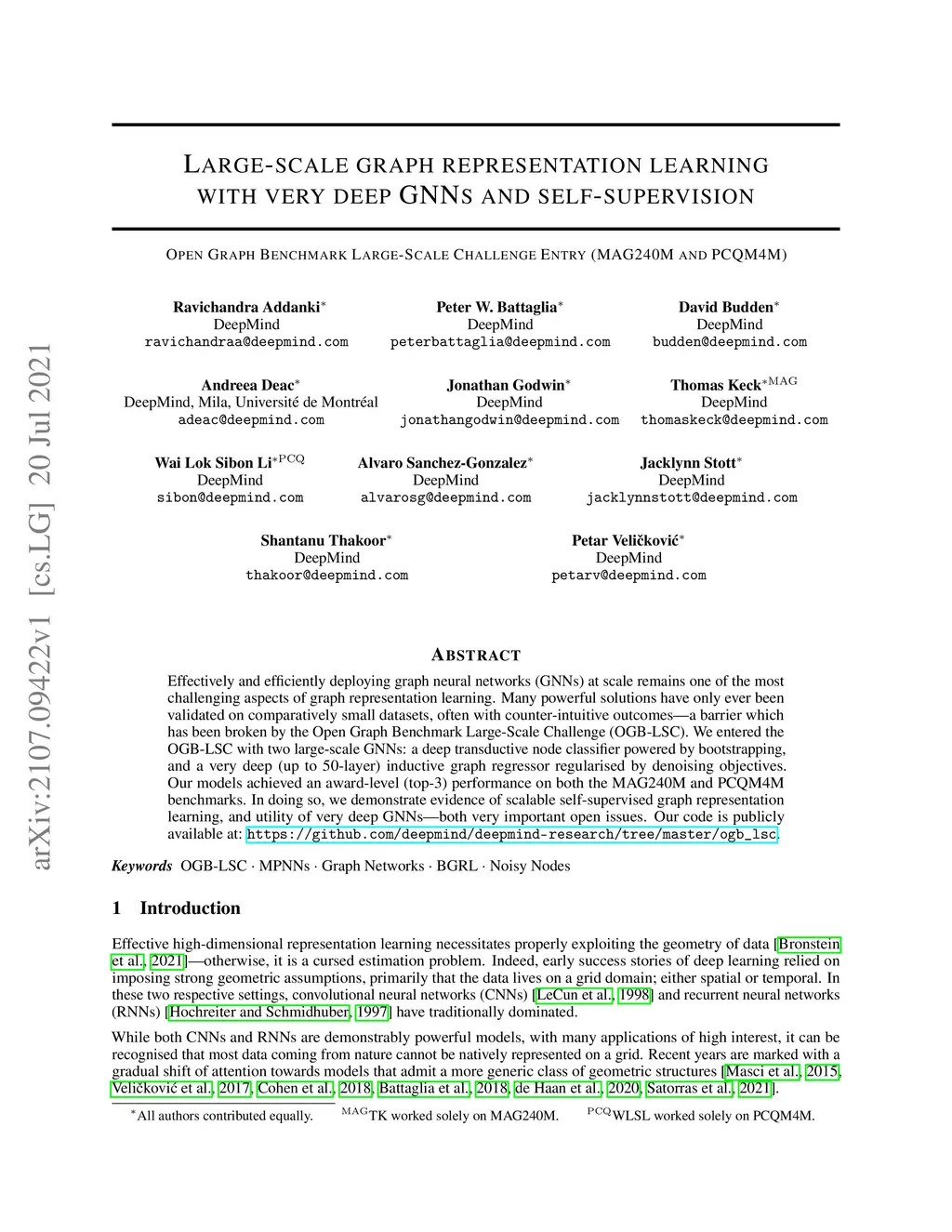 Effectively and efficiently deploying graph neural networks (GNNs) at scale remains one of the most challenging aspects of graph representation learning. Many powerful solutions have only ever been validated on comparatively small datasets, often with counter-intuitive outcomes -- a barrier which has been broken by the Open Graph Benchmark Large-Scale Challenge (OGB-LSC). We entered the OGB-LSC with two large-scale GNNs: a deep transductive node classifier powered by bootstrapping, and a very deep (up to 50-layer) inductive graph regressor regularised by denoising objectives. Our models achieved an award-level (top-3) performance on both the MAG240M and PCQM4M benchmarks. In doing so, we demonstrate evidence of scalable self-supervised graph representation learning, and utility of very deep GNNs -- both very important open issues. Our code is publicly available at: https://github.com/deepmind/deepmind-research/tree/master/ogb_lsc.