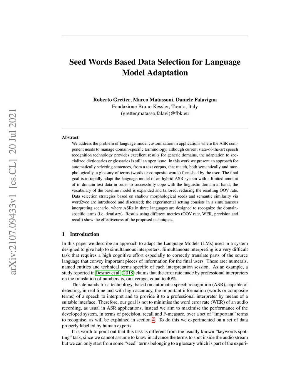 We address the problem of language model customization in applications where the ASR component needs to manage domain-specific terminology; although current state-of-the-art speech recognition technology provides excellent results for generic domains, the adaptation to specialized dictionaries or glossaries is still an open issue. In this work we present an approach for automatically selecting sentences, from a text corpus, that match, both semantically and morphologically, a glossary of terms (words or composite words) furnished by the user. The final goal is to rapidly adapt the language model of an hybrid ASR system with a limited amount of in-domain text data in order to successfully cope with the linguistic domain at hand; the vocabulary of the baseline model is expanded and tailored, reducing the resulting OOV rate. Data selection strategies based on shallow morphological seeds and semantic similarity viaword2vec are introduced and discussed; the experimental setting consists in a simultaneous interpreting scenario, where ASRs in three languages are designed to recognize the domain-specific terms (i.e. dentistry). Results using different metrics (OOV rate, WER, precision and recall) show the effectiveness of the proposed techniques.