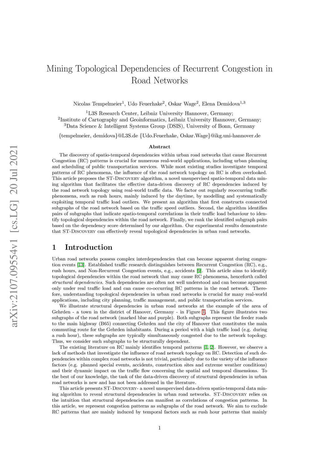 The discovery of spatio-temporal dependencies within urban road networks that cause Recurrent Congestion (RC) patterns is crucial for numerous real-world applications, including urban planning and scheduling of public transportation services. While most existing studies investigate temporal patterns of RC phenomena, the influence of the road network topology on RC is often overlooked. This article proposes the ST-Discovery algorithm, a novel unsupervised spatio-temporal data mining algorithm that facilitates the effective data-driven discovery of RC dependencies induced by the road network topology using real-world traffic data. We factor out regularly reoccurring traffic phenomena, such as rush hours, mainly induced by the daytime, by modelling and systematically exploiting temporal traffic load outliers. We present an algorithm that first constructs connected subgraphs of the road network based on the traffic speed outliers. Second, the algorithm identifies pairs of subgraphs that indicate spatio-temporal correlations in their traffic load behaviour to identify topological dependencies within the road network. Finally, we rank the identified subgraph pairs based on the dependency score determined by our algorithm. Our experimental results demonstrate that ST-Discovery can effectively reveal topological dependencies in urban road networks.