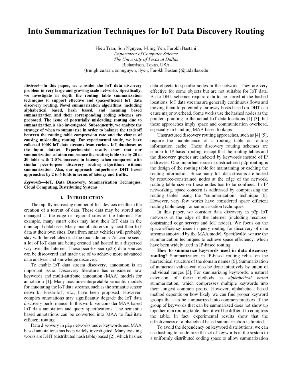 In this paper, we consider the IoT data discovery problem in very large and growing scale networks. Specifically, we investigate in depth the routing table summarization techniques to support effective and space-efficient IoT data discovery routing. Novel summarization algorithms, including alphabetical based, hash based, and meaning based summarization and their corresponding coding schemes are proposed. The issue of potentially misleading routing due to summarization is also investigated. Subsequently, we analyze the strategy of when to summarize in order to balance the tradeoff between the routing table compression rate and the chance of causing misleading routing. For experimental study, we have collected 100K IoT data streams from various IoT databases as the input dataset. Experimental results show that our summarization solution can reduce the routing table size by 20 to 30 folds with 2-5% increase in latency when compared with similar peer-to-peer discovery routing algorithms without summarization. Also, our approach outperforms DHT based approaches by 2 to 6 folds in terms of latency and traffic.