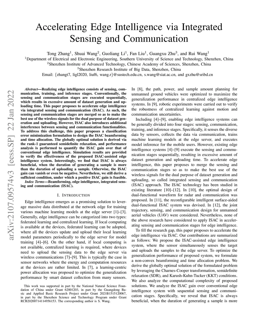 Realizing edge intelligence consists of sensing, communication, training, and inference stages. Conventionally, the sensing and communication stages are executed sequentially, which results in excessive amount of dataset generation and uploading time. This paper proposes to accelerate edge intelligence via integrated sensing and communication (ISAC). As such, the sensing and communication stages are merged so as to make the best use of the wireless signals for the dual purpose of dataset generation and uploading. However, ISAC also introduces additional interference between sensing and communication functionalities. To address this challenge, this paper proposes a classification error minimization formulation to design the ISAC beamforming and time allocation. The globally optimal solution is derived via the rank-1 guaranteed semidefinite relaxation, and performance analysis is performed to quantify the ISAC gain over that of conventional edge intelligence. Simulation results are provided to verify the effectiveness of the proposed ISAC-assisted edge intelligence system. Interestingly, we find that ISAC is always beneficial, when the duration of generating a sample is more than the duration of uploading a sample. Otherwise, the ISAC gain can vanish or even be negative. Nevertheless, we still derive a sufficient condition, under which a positive ISAC gain is feasible.