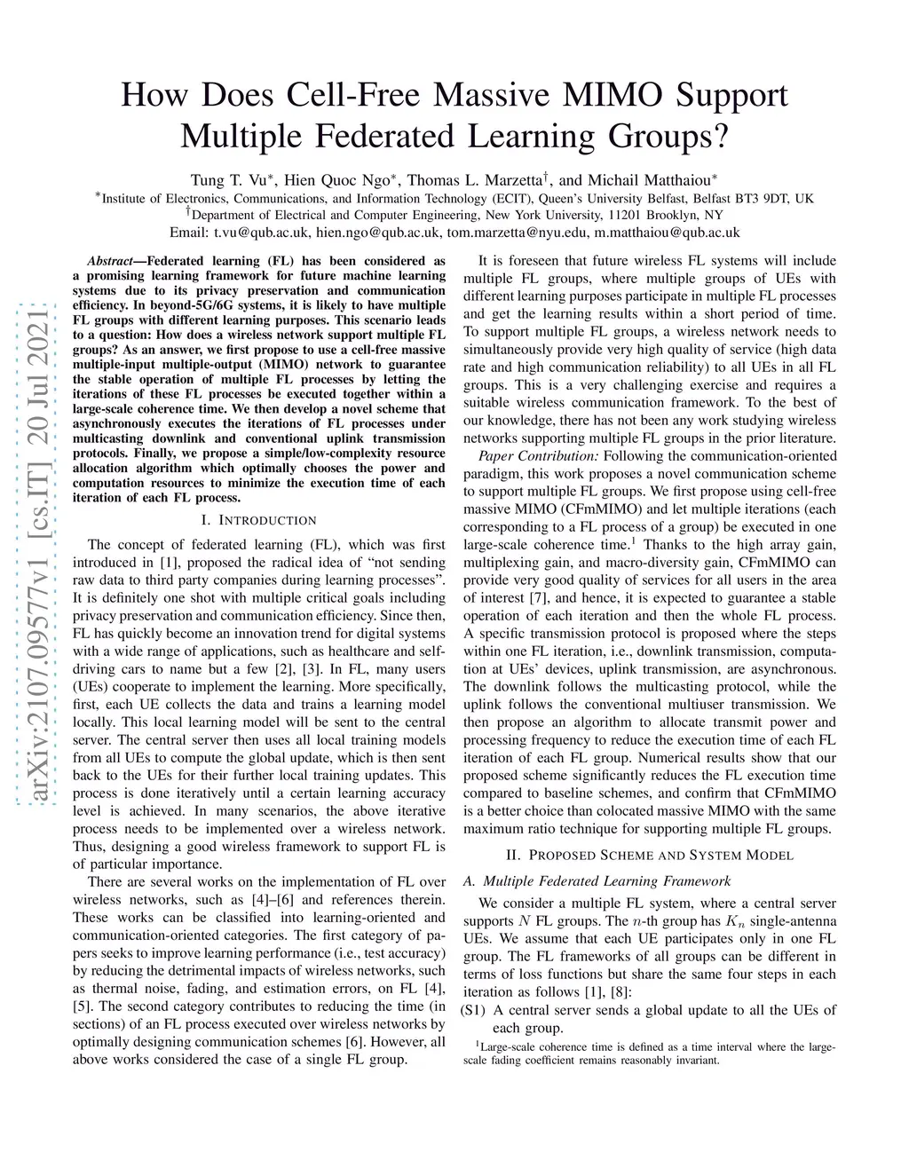 Federated learning (FL) has been considered as a promising learning framework for future machine learning systems due to its privacy preservation and communication efficiency. In beyond-5G/6G systems, it is likely to have multiple FL groups with different learning purposes. This scenario leads to a question: How does a wireless network support multiple FL groups? As an answer, we first propose to use a cell-free massive multiple-input multiple-output (MIMO) network to guarantee the stable operation of multiple FL processes by letting the iterations of these FL processes be executed together within a large-scale coherence time. We then develop a novel scheme that asynchronously executes the iterations of FL processes under multicasting downlink and conventional uplink transmission protocols. Finally, we propose a simple/low-complexity resource allocation algorithm which optimally chooses the power and computation resources to minimize the execution time of each iteration of each FL process.