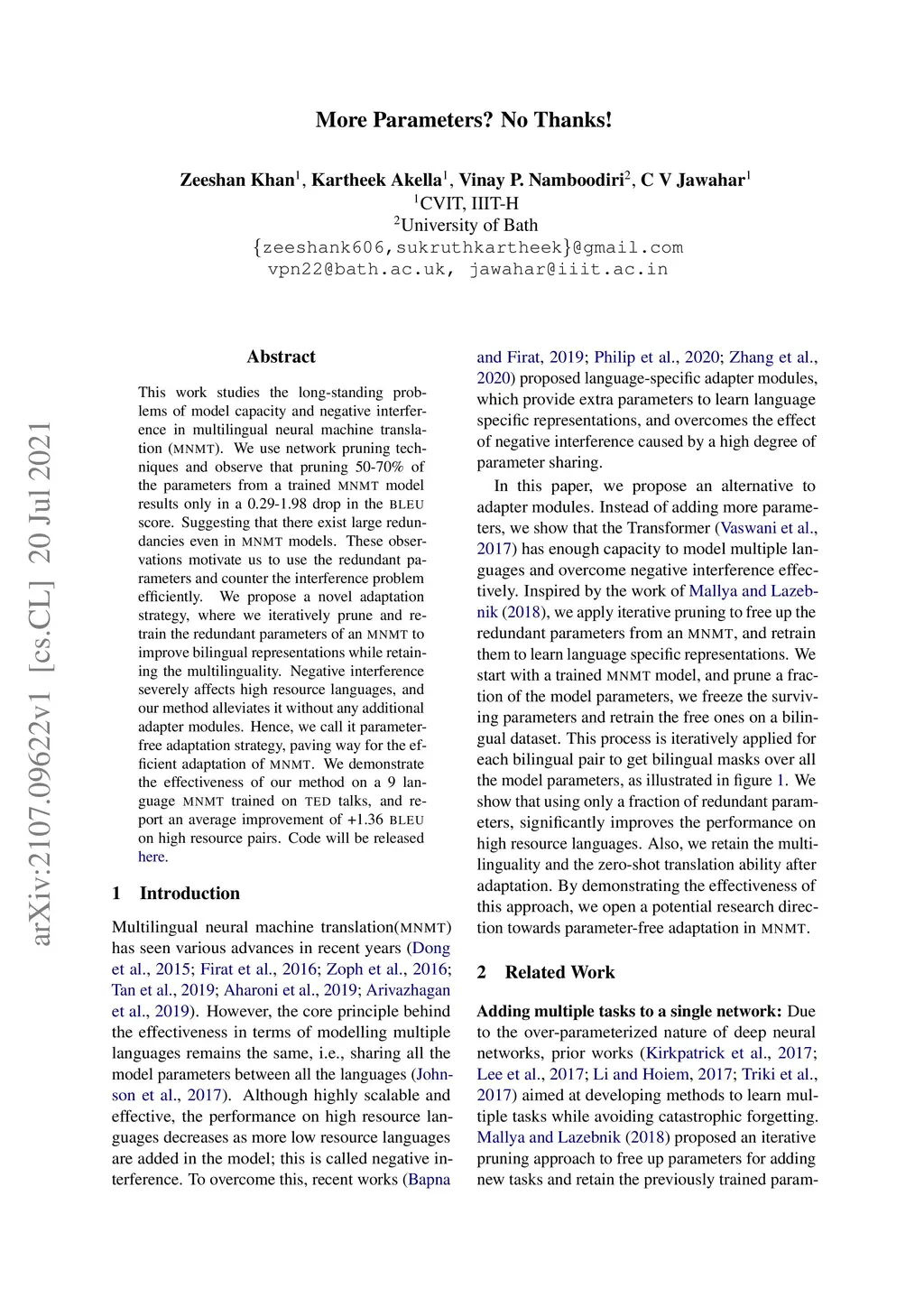 This work studies the long-standing problems of model capacity and negative interference in multilingual neural machine translation MNMT. We use network pruning techniques and observe that pruning 50-70% of the parameters from a trained MNMT model results only in a 0.29-1.98 drop in the BLEU score. Suggesting that there exist large redundancies even in MNMT models. These observations motivate us to use the redundant parameters and counter the interference problem efficiently. We propose a novel adaptation strategy, where we iteratively prune and retrain the redundant parameters of an MNMT to improve bilingual representations while retaining the multilinguality. Negative interference severely affects high resource languages, and our method alleviates it without any additional adapter modules. Hence, we call it parameter-free adaptation strategy, paving way for the efficient adaptation of MNMT. We demonstrate the effectiveness of our method on a 9 language MNMT trained on TED talks, and report an average improvement of +1.36 BLEU on high resource pairs. Code will be released here.