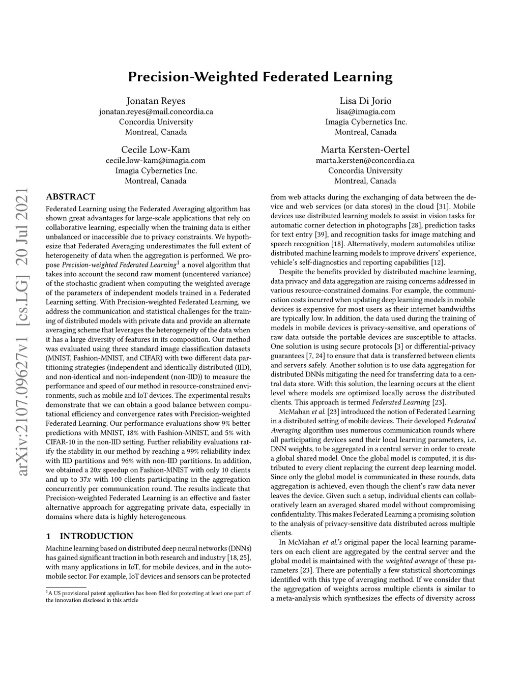 Federated Learning using the Federated Averaging algorithm has shown great advantages for large-scale applications that rely on collaborative learning, especially when the training data is either unbalanced or inaccessible due to privacy constraints. We hypothesize that Federated Averaging underestimates the full extent of heterogeneity of data when the aggregation is performed. We propose Precision-weighted Federated Learning a novel algorithm that takes into account the variance of the stochastic gradients when computing the weighted average of the parameters of models trained in a Federated Learning setting. With Precision-weighted Federated Learning, we provide an alternate averaging scheme that leverages the heterogeneity of the data when it has a large diversity of features in its composition. Our method was evaluated using standard image classification datasets with two different data partitioning strategies (IID/non-IID) to measure the performance and speed of our method in resource-constrained environments, such as mobile and IoT devices. We obtained a good balance between computational efficiency and convergence rates with Precision-weighted Federated Learning. Our performance evaluations show 9% better predictions with MNIST, 18% with Fashion-MNIST, and 5% with CIFAR-10 in the non-IID setting. Further reliability evaluations ratify the stability in our method by reaching a 99% reliability index with IID partitions and 96% with non-IID partitions. In addition, we obtained a 20x speedup on Fashion-MNIST with only 10 clients and up to 37x with 100 clients participating in the aggregation concurrently per communication round. The results indicate that Precision-weighted Federated Learning is an effective and faster alternative approach for aggregating private data, especially in domains where data is highly heterogeneous.