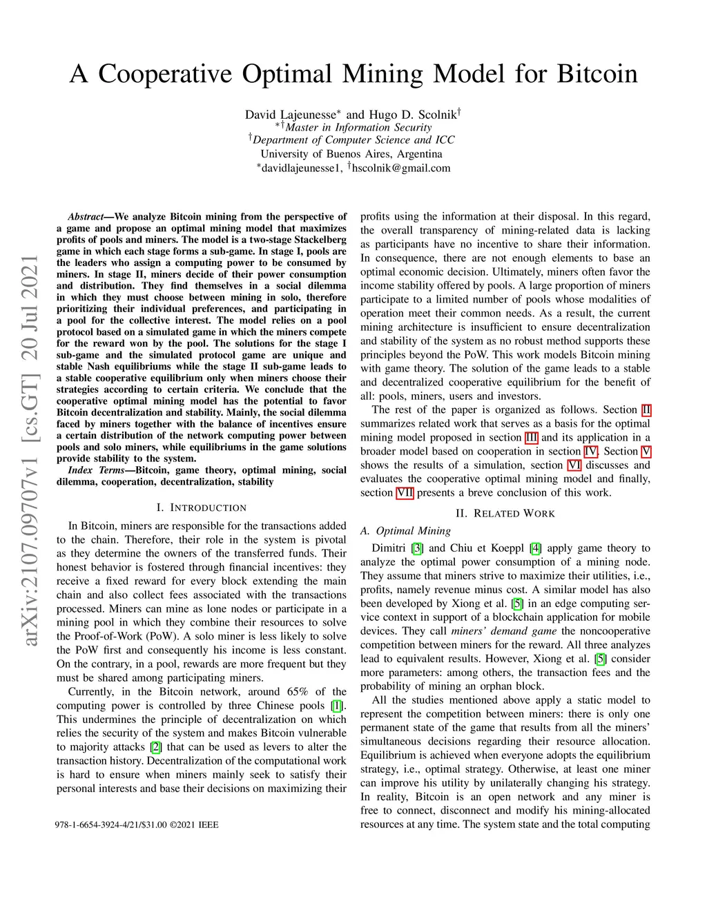 We analyze Bitcoin mining from the perspective of a game and propose an optimal mining model that maximizes profits of pools and miners. The model is a two-stage Stackelberg game in which each stage forms a sub-game. In stage I, pools are the leaders who assign a computing power to be consumed by miners. In stage II, miners decide of their power consumption and distribution. They find themselves in a social dilemma in which they must choose between mining in solo, therefore prioritizing their individual preferences, and participating in a pool for the collective interest. The model relies on a pool protocol based on a simulated game in which the miners compete for the reward won by the pool. The solutions for the stage I sub-game and the simulated protocol game are unique and stable Nash equilibriums while the stage II sub-game leads to a stable cooperative equilibrium only when miners choose their strategies according to certain criteria. We conclude that the cooperative optimal mining model has the potential to favor Bitcoin decentralization and stability. Mainly, the social dilemma faced by miners together with the balance of incentives ensure a certain distribution of the network computing power between pools and solo miners, while equilibriums in the game solutions provide stability to the system.