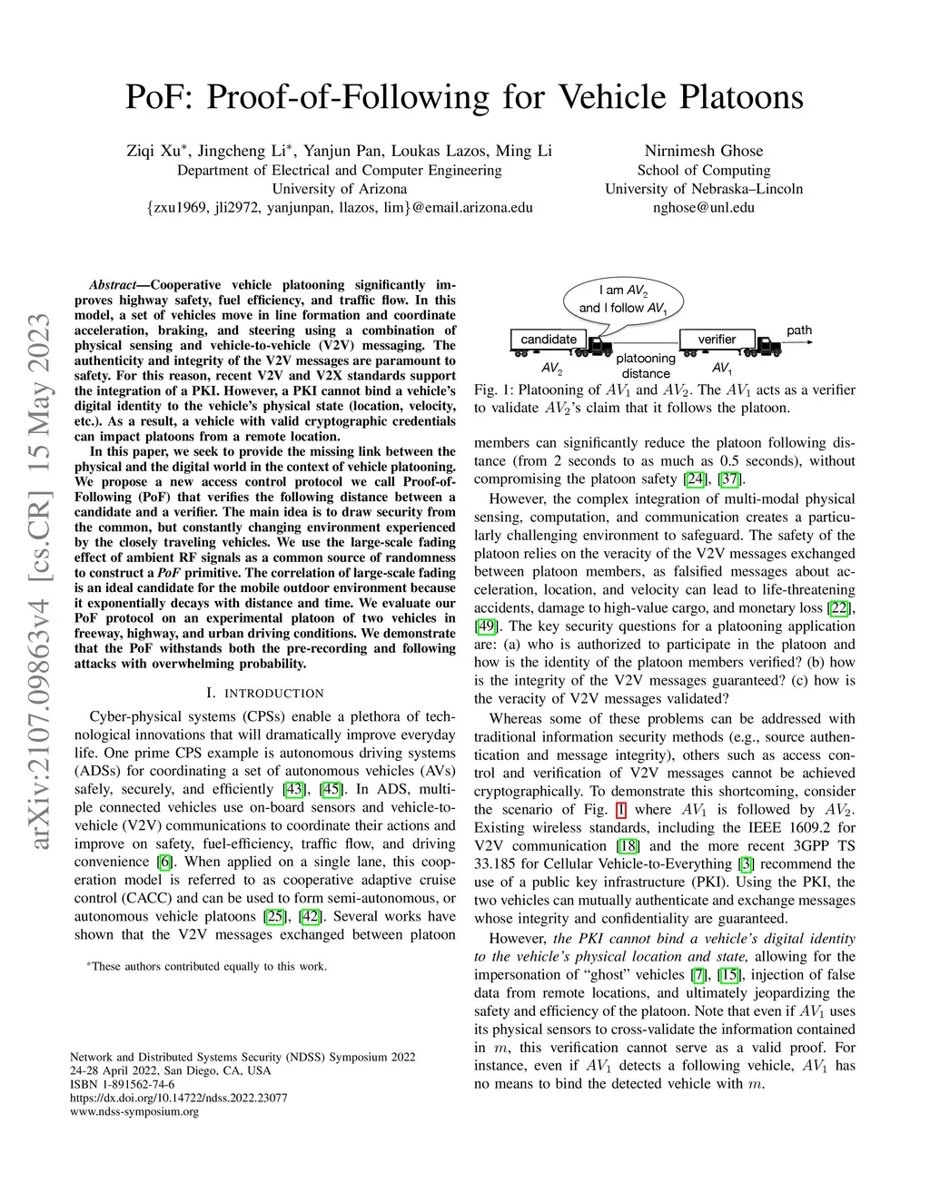 Cooperative vehicle platooning significantly improves highway safety, fuel efficiency, and traffic flow. In this model, a set of vehicles move in line formation and coordinate acceleration, braking, and steering using a combination of physical sensing and vehicle-to-vehicle (V2V) messaging. The authenticity and integrity of the V2V messages are paramount to safety. For this reason, recent V2V and V2X standards support the integration of a PKI. However, a PKI cannot bind a vehicle's digital identity to the vehicle's physical state (location, velocity, etc.). As a result, a vehicle with valid cryptographic credentials can impact platoons from a remote location. In this paper, we seek to provide the missing link between the physical and the digital world in the context of vehicle platooning. We propose a new access control protocol we call Proof-of-Following (PoF) that verifies the following distance between a candidate and a verifier. The main idea is to draw security from the common, but constantly changing environment experienced by the closely traveling vehicles. We use the large-scale fading effect of ambient RF signals as a common source of randomness to construct a {\em PoF} primitive. The correlation of large-scale fading is an ideal candidate for the mobile outdoor environment because it exponentially decays with distance and time. We evaluate our PoF protocol on an experimental platoon of two vehicles in freeway, highway, and urban driving conditions. We demonstrate that the PoF withstands both the pre-recording and following attacks with overwhelming probability.