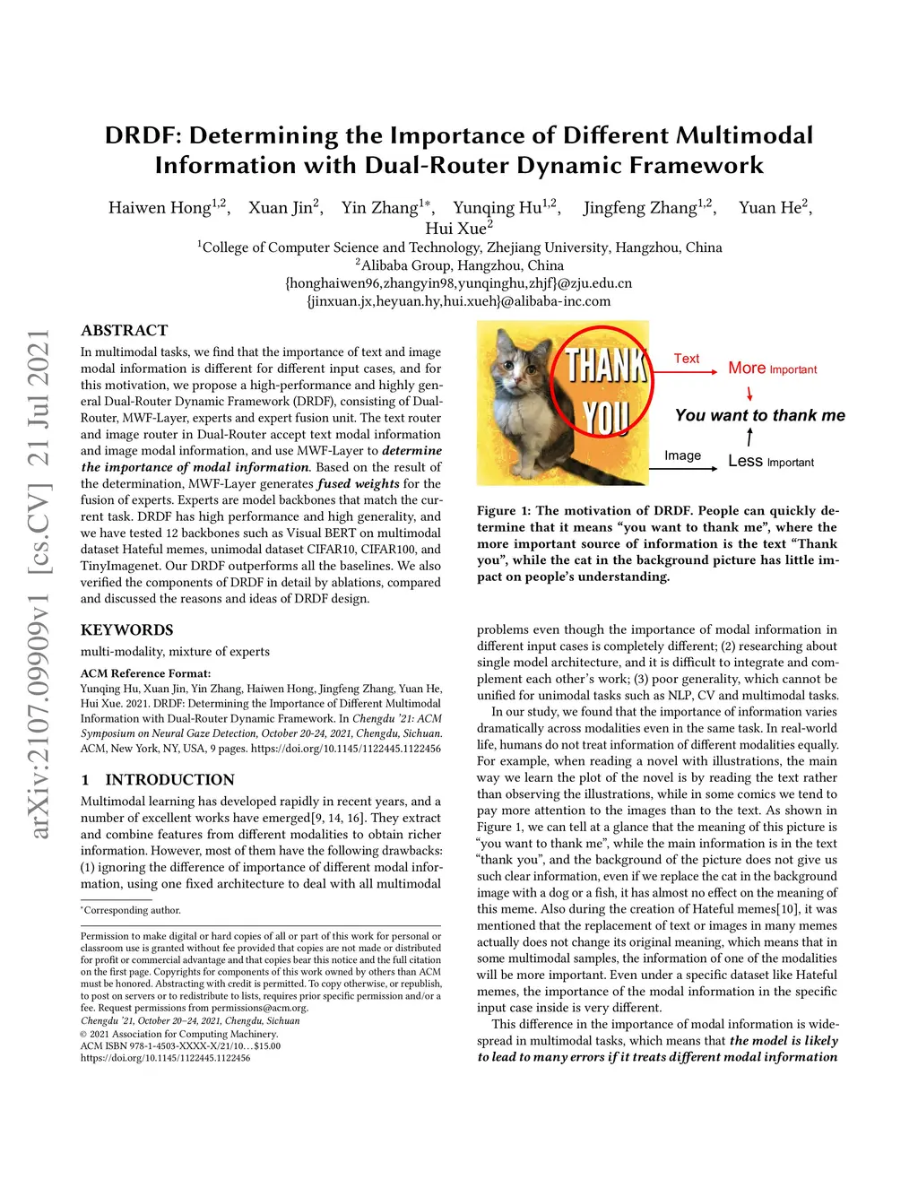 In multimodal tasks, we find that the importance of text and image modal information is different for different input cases, and for this motivation, we propose a high-performance and highly general Dual-Router Dynamic Framework (DRDF), consisting of Dual-Router, MWF-Layer, experts and expert fusion unit. The text router and image router in Dual-Router accept text modal information and image modal information, and use MWF-Layer to determine the importance of modal information. Based on the result of the determination, MWF-Layer generates fused weights for the fusion of experts. Experts are model backbones that match the current task. DRDF has high performance and high generality, and we have tested 12 backbones such as Visual BERT on multimodal dataset Hateful memes, unimodal dataset CIFAR10, CIFAR100, and TinyImagenet. Our DRDF outperforms all the baselines. We also verified the components of DRDF in detail by ablations, compared and discussed the reasons and ideas of DRDF design.
