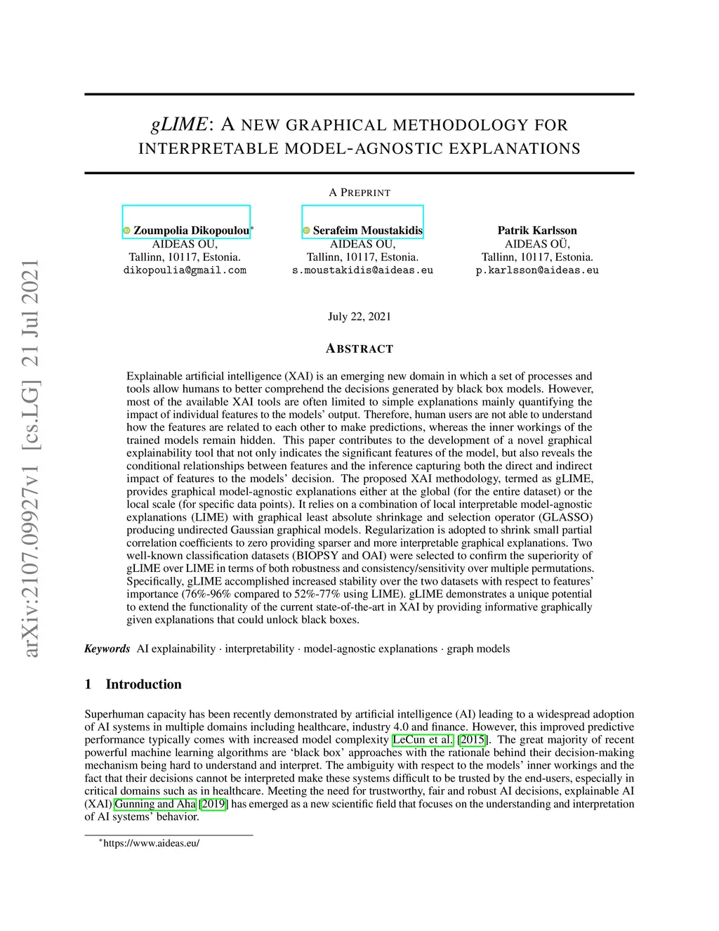 Explainable artificial intelligence (XAI) is an emerging new domain in which a set of processes and tools allow humans to better comprehend the decisions generated by black box models. However, most of the available XAI tools are often limited to simple explanations mainly quantifying the impact of individual features to the models' output. Therefore, human users are not able to understand how the features are related to each other to make predictions, whereas the inner workings of the trained models remain hidden. This paper contributes to the development of a novel graphical explainability tool that not only indicates the significant features of the model but also reveals the conditional relationships between features and the inference capturing both the direct and indirect impact of features to the models' decision. The proposed XAI methodology, termed as gLIME, provides graphical model-agnostic explanations either at the global (for the entire dataset) or the local scale (for specific data points). It relies on a combination of local interpretable model-agnostic explanations (LIME) with graphical least absolute shrinkage and selection operator (GLASSO) producing undirected Gaussian graphical models. Regularization is adopted to shrink small partial correlation coefficients to zero providing sparser and more interpretable graphical explanations. Two well-known classification datasets (BIOPSY and OAI) were selected to confirm the superiority of gLIME over LIME in terms of both robustness and consistency over multiple permutations. Specifically, gLIME accomplished increased stability over the two datasets with respect to features' importance (76%-96% compared to 52%-77% using LIME). gLIME demonstrates a unique potential to extend the functionality of the current state-of-the-art in XAI by providing informative graphically given explanations that could unlock black boxes.