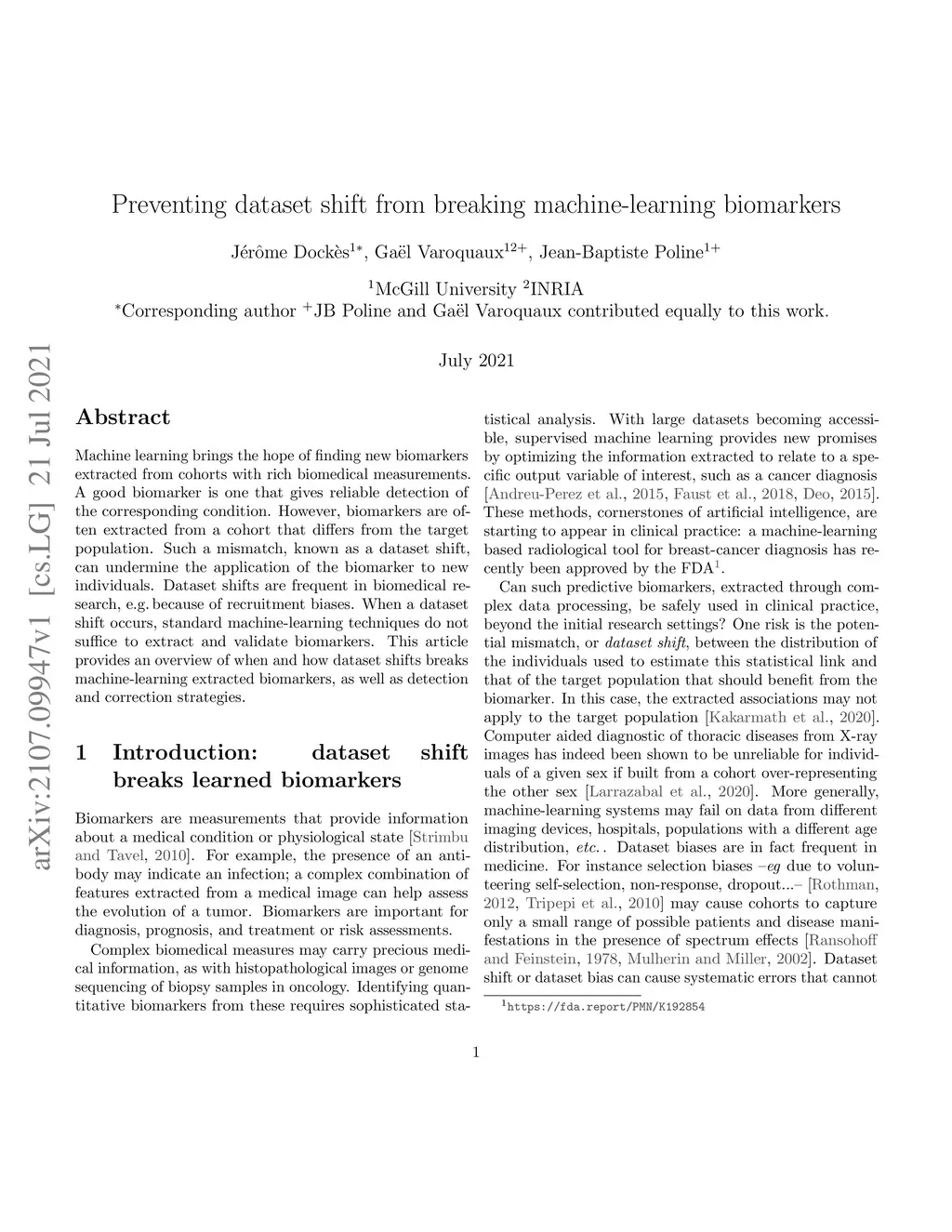 Machine learning brings the hope of finding new biomarkers extracted from cohorts with rich biomedical measurements. A good biomarker is one that gives reliable detection of the corresponding condition. However, biomarkers are often extracted from a cohort that differs from the target population. Such a mismatch, known as a dataset shift, can undermine the application of the biomarker to new individuals. Dataset shifts are frequent in biomedical research, e.g. because of recruitment biases. When a dataset shift occurs, standard machine-learning techniques do not suffice to extract and validate biomarkers. This article provides an overview of when and how dataset shifts breaks machine-learning extracted biomarkers, as well as detection and correction strategies.