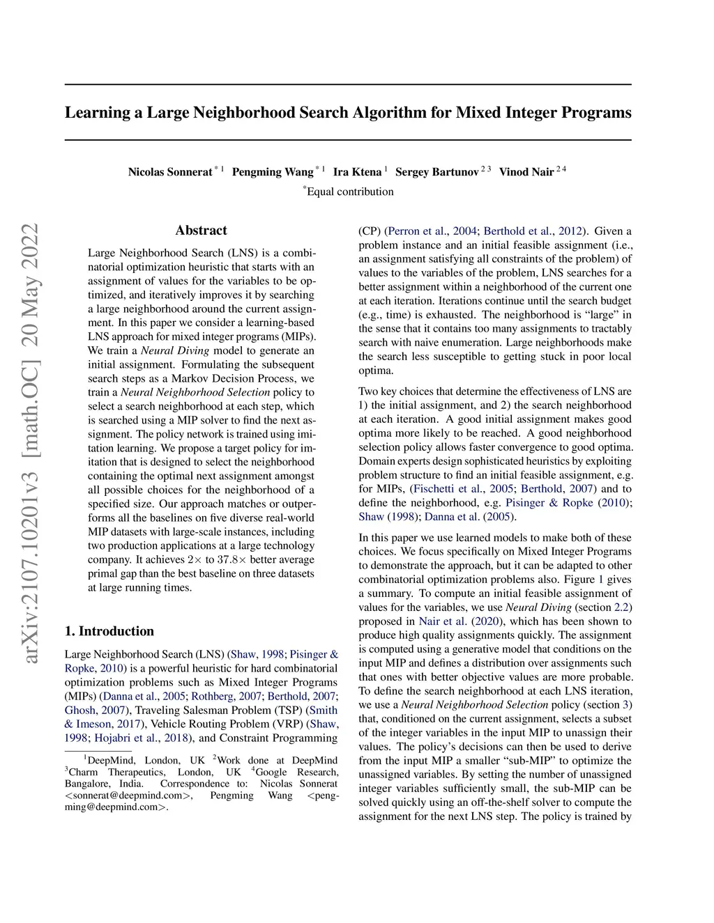 Large Neighborhood Search (LNS) is a combinatorial optimization heuristic that starts with an assignment of values for the variables to be optimized, and iteratively improves it by searching a large neighborhood around the current assignment. In this paper we consider a learning-based LNS approach for mixed integer programs (MIPs). We train a Neural Diving model to represent a probability distribution over assignments, which, together with an off-the-shelf MIP solver, generates an initial assignment. Formulating the subsequent search steps as a Markov Decision Process, we train a Neural Neighborhood Selection policy to select a search neighborhood at each step, which is searched using a MIP solver to find the next assignment. The policy network is trained using imitation learning. We propose a target policy for imitation that, given enough compute resources, is guaranteed to select the neighborhood containing the optimal next assignment amongst all possible choices for the neighborhood of a specified size. Our approach matches or outperforms all the baselines on five real-world MIP datasets with large-scale instances from diverse applications, including two production applications at Google. It achieves to better average primal gap than the best baseline on three of the datasets at large running times.