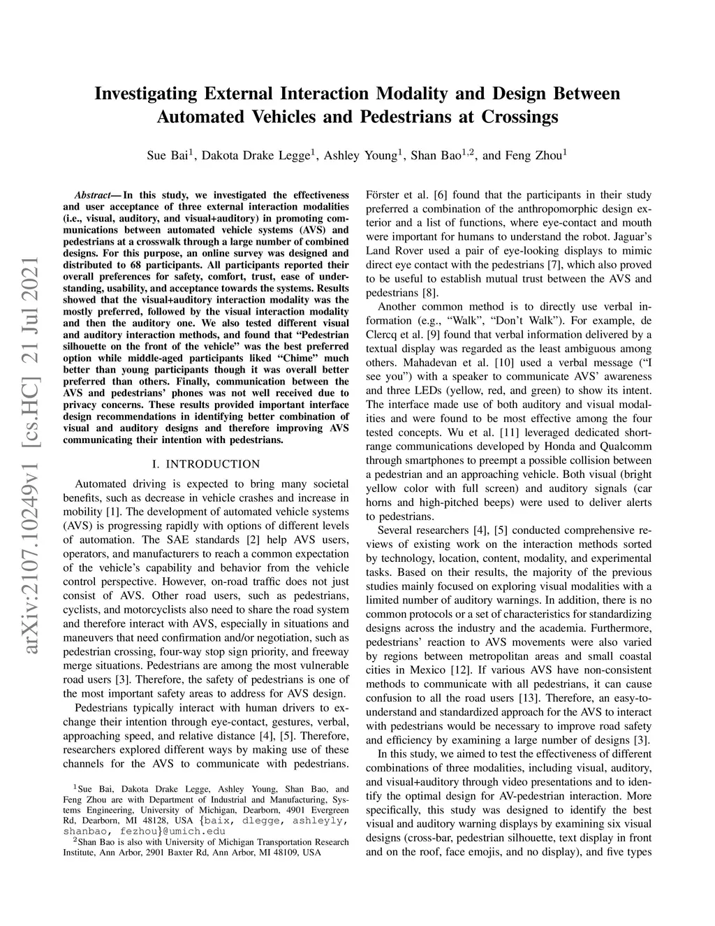 In this study, we investigated the effectiveness and user acceptance of three external interaction modalities (i.e., visual, auditory, and visual+auditory) in promoting communications between automated vehicle systems (AVS) and pedestrians at a crosswalk through a large number of combined designs. For this purpose, an online survey was designed and distributed to 68 participants. All participants reported their overall preferences for safety, comfort, trust, ease of understanding, usability, and acceptance towards the systems. Results showed that the visual+auditory interaction modality was the mostly preferred, followed by the visual interaction modality and then the auditory one. We also tested different visual and auditory interaction methods, and found that "Pedestrian silhouette on the front of the vehicle" was the best preferred option while middle-aged participants liked "Chime" much better than young participants though it was overall better preferred than others. Finally, communication between the AVS and pedestrians' phones was not well received due to privacy concerns. These results provided important interface design recommendations in identifying better combination of visual and auditory designs and therefore improving AVS communicating their intention with pedestrians.