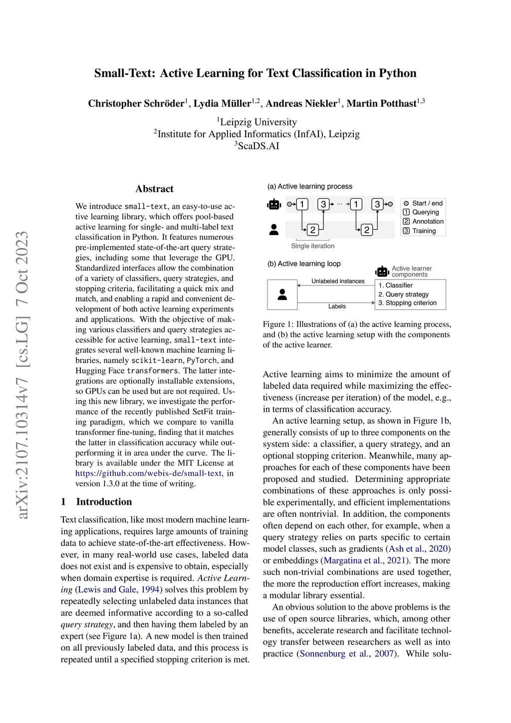 We introduce small-text, an easy-to-use active learning library, which offers pool-based active learning for single- and multi-label text classification in Python. It features numerous pre-implemented state-of-the-art query strategies, including some that leverage the GPU. Standardized interfaces allow the combination of a variety of classifiers, query strategies, and stopping criteria, facilitating a quick mix and match, and enabling a rapid and convenient development of both active learning experiments and applications. With the objective of making various classifiers and query strategies accessible for active learning, small-text integrates several well-known machine learning libraries, namely scikit-learn, PyTorch, and Hugging Face transformers. The latter integrations are optionally installable extensions, so GPUs can be used but are not required. Using this new library, we investigate the performance of the recently published SetFit training paradigm, which we compare to vanilla transformer fine-tuning, finding that it matches the latter in classification accuracy while outperforming it in area under the curve. The library is available under the MIT License at https://github.com/webis-de/small-text, in version 1.3.0 at the time of writing.