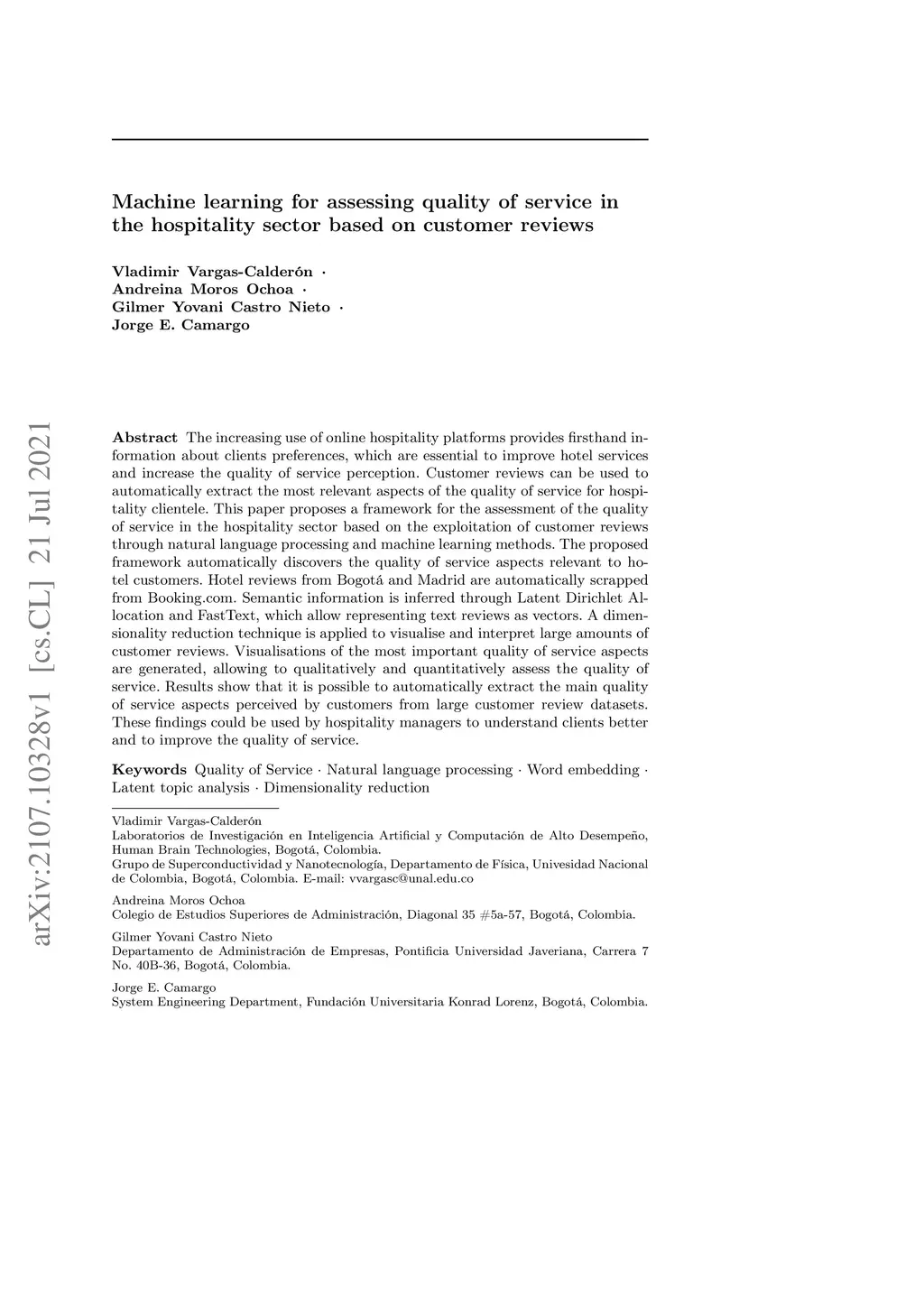 The increasing use of online hospitality platforms provides firsthand information about clients preferences, which are essential to improve hotel services and increase the quality of service perception. Customer reviews can be used to automatically extract the most relevant aspects of the quality of service for hospitality clientele. This paper proposes a framework for the assessment of the quality of service in the hospitality sector based on the exploitation of customer reviews through natural language processing and machine learning methods. The proposed framework automatically discovers the quality of service aspects relevant to hotel customers. Hotel reviews from Bogot\á and Madrid are automatically scrapped from Booking.com. Semantic information is inferred through Latent Dirichlet Allocation and FastText, which allow representing text reviews as vectors. A dimensionality reduction technique is applied to visualise and interpret large amounts of customer reviews. Visualisations of the most important quality of service aspects are generated, allowing to qualitatively and quantitatively assess the quality of service. Results show that it is possible to automatically extract the main quality of service aspects perceived by customers from large customer review datasets. These findings could be used by hospitality managers to understand clients better and to improve the quality of service.