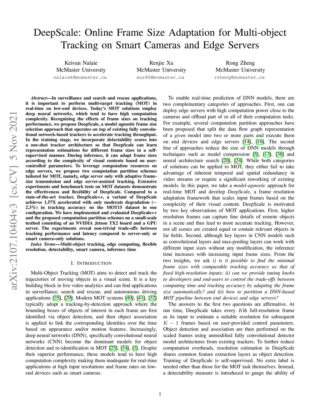 In surveillance and search and rescue applications, it is important to perform multi-target tracking (MOT) in real-time on low-end devices. Today's MOT solutions employ deep neural networks, which tend to have high computation complexity. Recognizing the effects of frame sizes on tracking performance, we propose DeepScale, a model agnostic frame size selection approach that operates on top of existing fully convolutional network-based trackers to accelerate tracking throughput. In the training stage, we incorporate detectability scores into a one-shot tracker architecture so that DeepScale can learn representation estimations for different frame sizes in a self-supervised manner. During inference, it can adapt frame sizes according to the complexity of visual contents based on user-controlled parameters. To leverage computation resources on edge servers, we propose two computation partition schemes tailored for MOT, namely, edge server only with adaptive frame-size transmission and edge server-assisted tracking. Extensive experiments and benchmark tests on MOT datasets demonstrate the effectiveness and flexibility of DeepScale. Compared to a state-of-the-art tracker, DeepScale++, a variant of DeepScale achieves 1.57X accelerated with only moderate degradation ~2.3\ in tracking accuracy on the MOT15 dataset in one configuration. We have implemented and evaluated DeepScale++ and the proposed computation partition schemes on a small-scale testbed consisting of an NVIDIA Jetson TX2 board and a GPU server. The experiments reveal non-trivial trade-offs between tracking performance and latency compared to server-only or smart camera-only solutions.