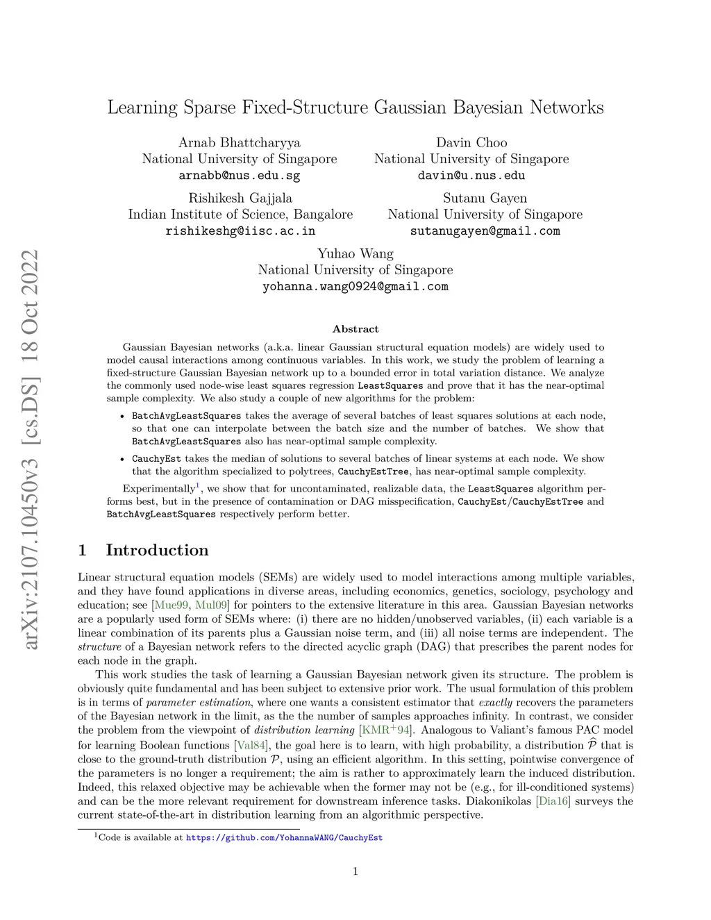 Gaussian Bayesian networks (a.k.a. linear Gaussian structural equation models) are widely used to model causal interactions among continuous variables. In this work, we study the problem of learning a fixed-structure Gaussian Bayesian network up to a bounded error in total variation distance. We analyze the commonly used node-wise least squares regression (LeastSquares) and prove that it has a near-optimal sample complexity. We also study a couple of new algorithms for the problem: - BatchAvgLeastSquares takes the average of several batches of least squares solutions at each node, so that one can interpolate between the batch size and the number of batches. We show that BatchAvgLeastSquares also has near-optimal sample complexity. - CauchyEst takes the median of solutions to several batches of linear systems at each node. We show that the algorithm specialized to polytrees, CauchyEstTree, has near-optimal sample complexity. Experimentally, we show that for uncontaminated, realizable data, the LeastSquares algorithm performs best, but in the presence of contamination or DAG misspecification, CauchyEst/CauchyEstTree and BatchAvgLeastSquares respectively perform better.