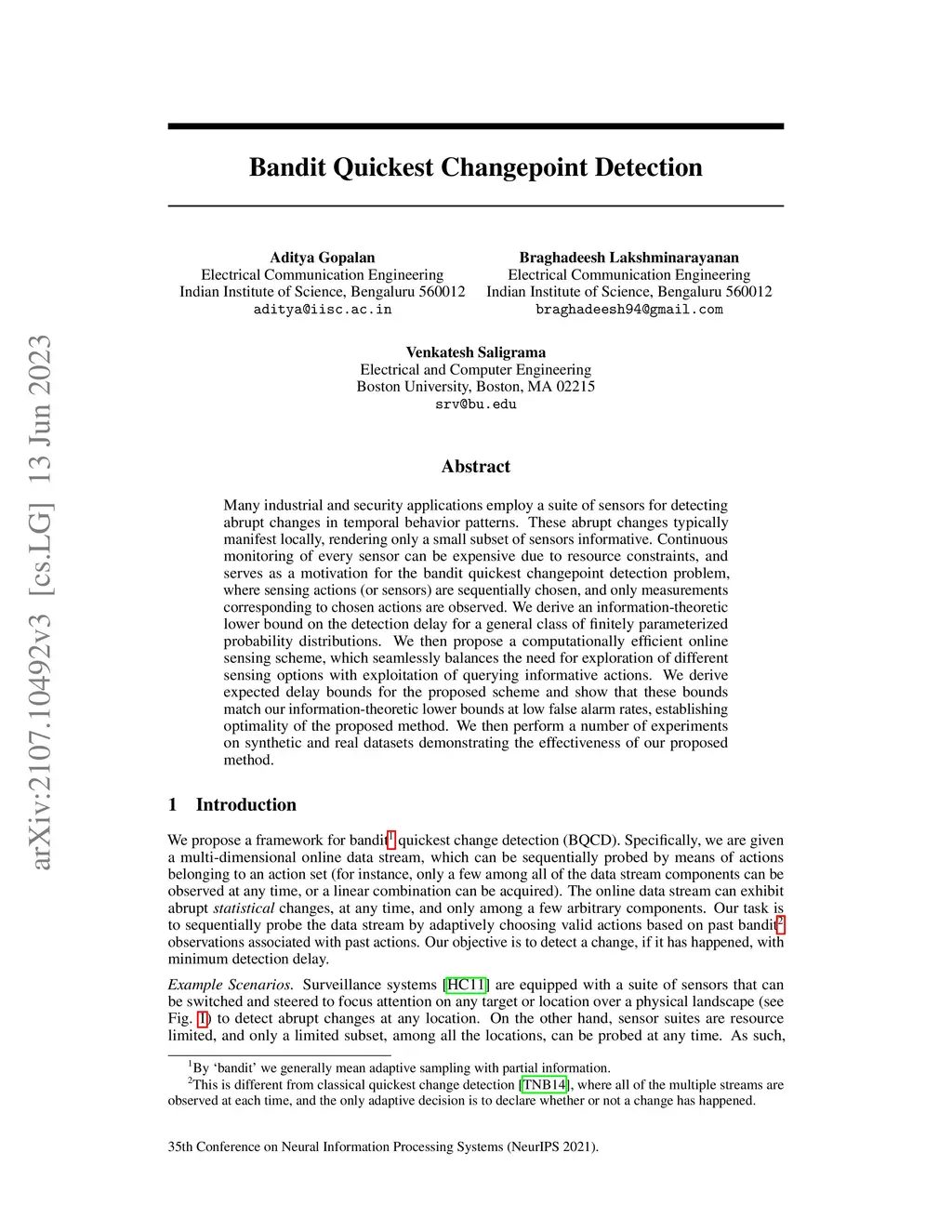 Many industrial and security applications employ a suite of sensors for detecting abrupt changes in temporal behavior patterns. These abrupt changes typically manifest locally, rendering only a small subset of sensors informative. Continuous monitoring of every sensor can be expensive due to resource constraints, and serves as a motivation for the bandit quickest changepoint detection problem, where sensing actions (or sensors) are sequentially chosen, and only measurements corresponding to chosen actions are observed. We derive an information-theoretic lower bound on the detection delay for a general class of finitely parameterized probability distributions. We then propose a computationally efficient online sensing scheme, which seamlessly balances the need for exploration of different sensing options with exploitation of querying informative actions. We derive expected delay bounds for the proposed scheme and show that these bounds match our information-theoretic lower bounds at low false alarm rates, establishing optimality of the proposed method. We then perform a number of experiments on synthetic and real datasets demonstrating the effectiveness of our proposed method.