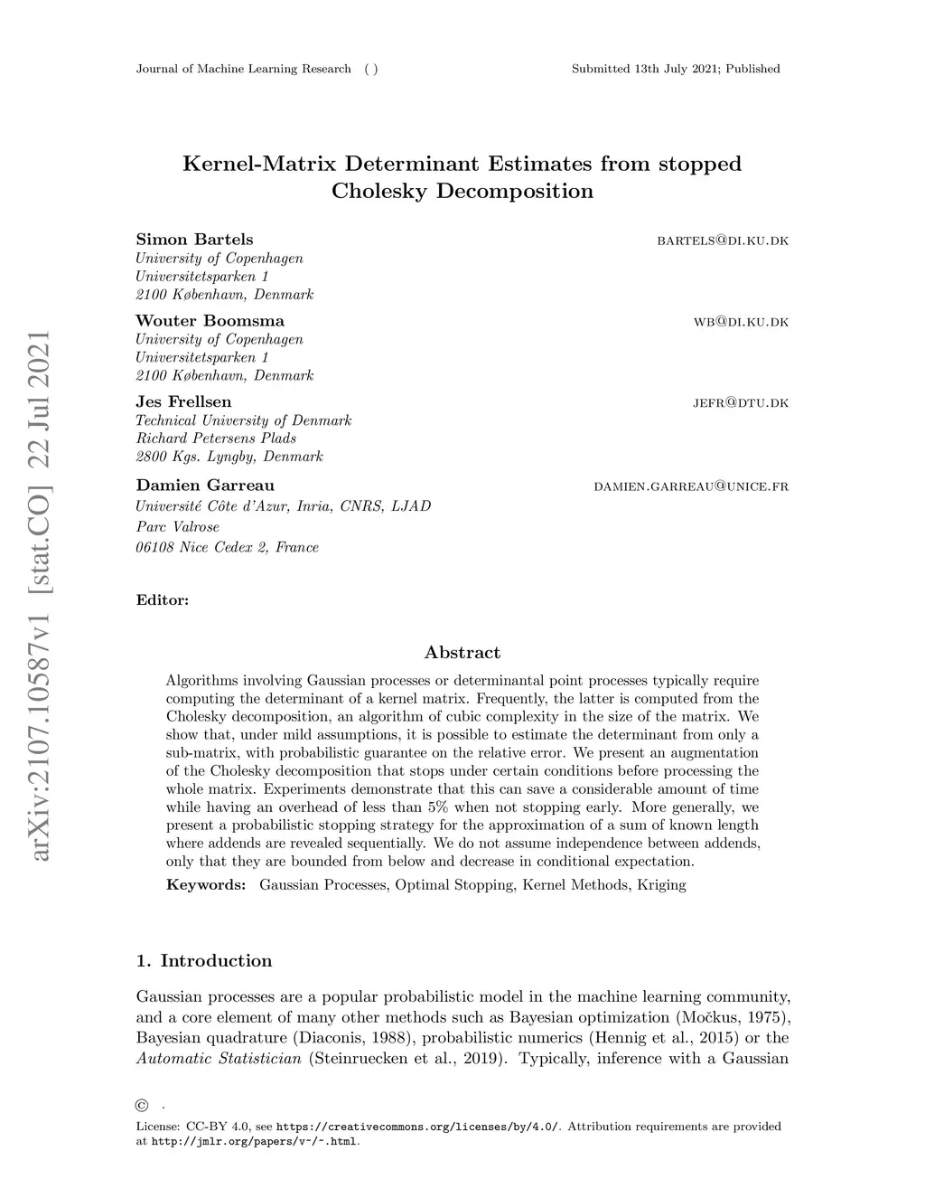 Kernel-Matrix Determinant Estimates from stopped Cholesky Decomposition