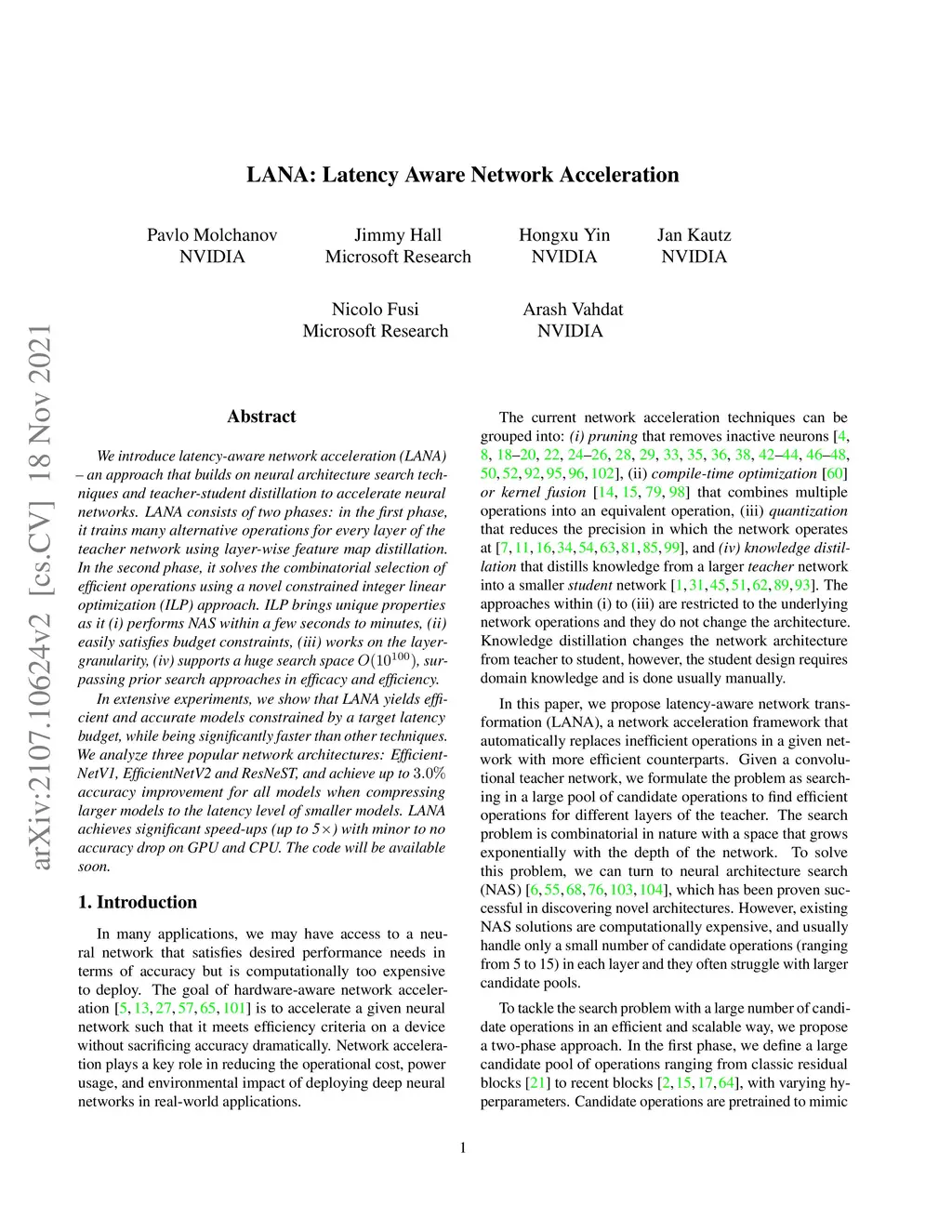 We introduce latency-aware network acceleration (LANA) - an approach that builds on neural architecture search techniques and teacher-student distillation to accelerate neural networks. LANA consists of two phases: in the first phase, it trains many alternative operations for every layer of the teacher network using layer-wise feature map distillation. In the second phase, it solves the combinatorial selection of efficient operations using a novel constrained integer linear optimization (ILP) approach. ILP brings unique properties as it (i) performs NAS within a few seconds to minutes, (ii) easily satisfies budget constraints, (iii) works on the layer-granularity, (iv) supports a huge search space , surpassing prior search approaches in efficacy and efficiency. In extensive experiments, we show that LANA yields efficient and accurate models constrained by a target latency budget, while being significantly faster than other techniques. We analyze three popular network architectures: EfficientNetV1, EfficientNetV2 and ResNeST, and achieve accuracy improvement for all models (up to ) when compressing larger models to the latency level of smaller models. LANA achieves significant speed-ups (up to ) with minor to no accuracy drop on GPU and CPU. The code will be shared soon.