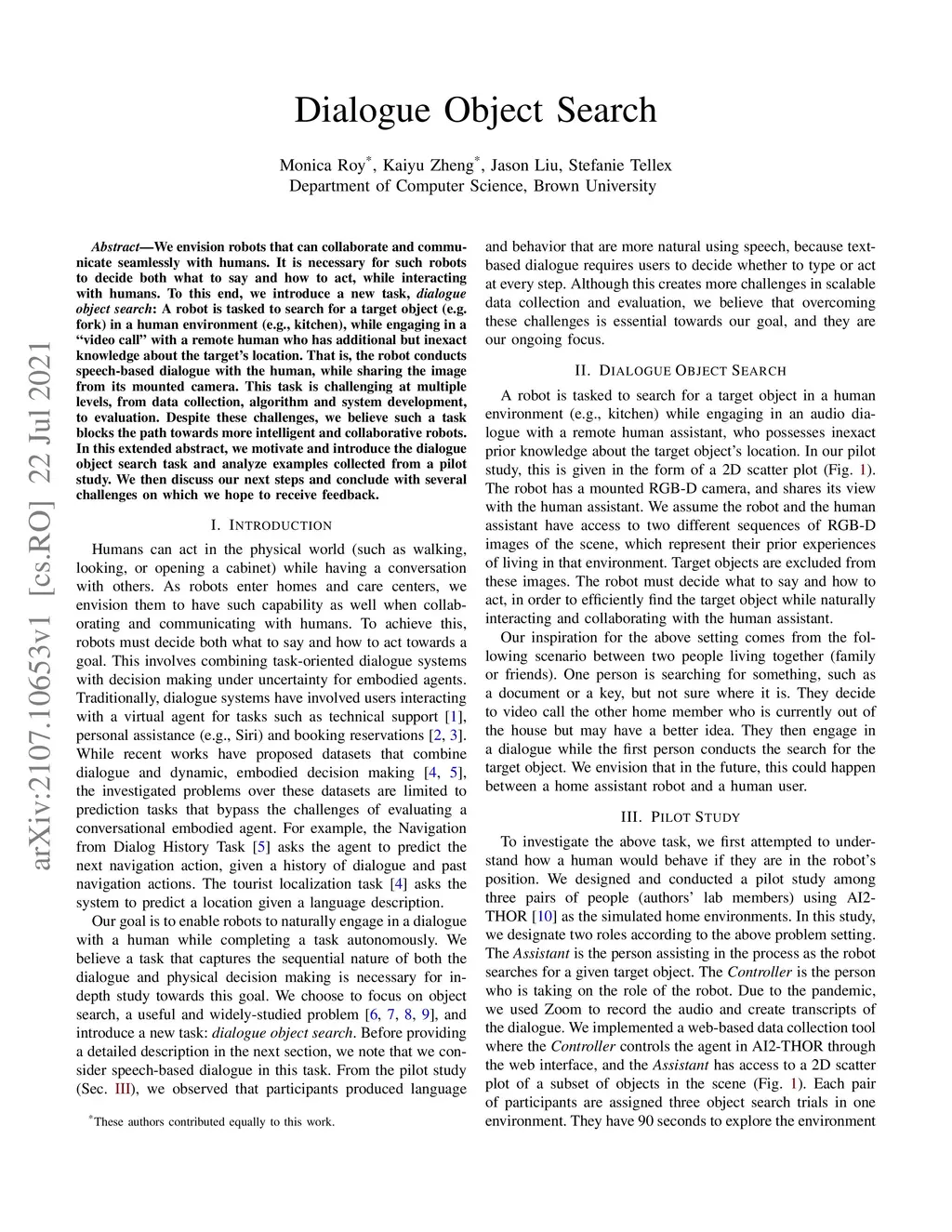 We envision robots that can collaborate and communicate seamlessly with humans. It is necessary for such robots to decide both what to say and how to act, while interacting with humans. To this end, we introduce a new task, dialogue object search: A robot is tasked to search for a target object (e.g. fork) in a human environment (e.g., kitchen), while engaging in a "video call" with a remote human who has additional but inexact knowledge about the target's location. That is, the robot conducts speech-based dialogue with the human, while sharing the image from its mounted camera. This task is challenging at multiple levels, from data collection, algorithm and system development,to evaluation. Despite these challenges, we believe such a task blocks the path towards more intelligent and collaborative robots. In this extended abstract, we motivate and introduce the dialogue object search task and analyze examples collected from a pilot study. We then discuss our next steps and conclude with several challenges on which we hope to receive feedback.