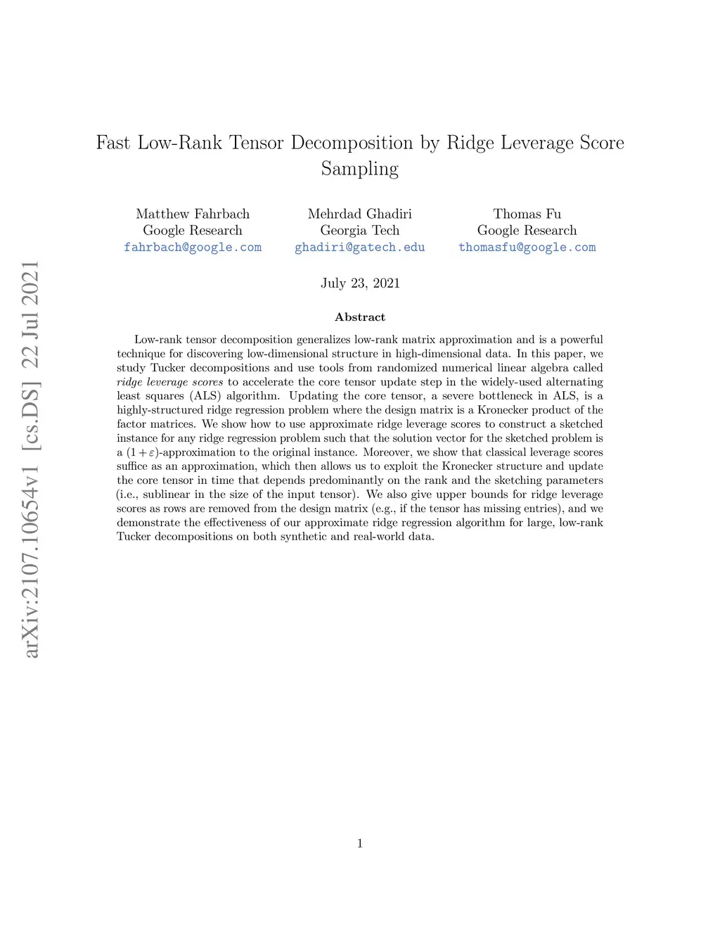 Fast Low-Rank Tensor Decomposition by Ridge Leverage Score Sampling