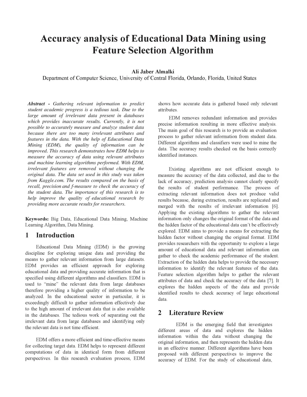 Gathering relevant information to predict student academic progress is a tedious task. Due to the large amount of irrelevant data present in databases which provides inaccurate results. Currently, it is not possible to accurately measure and analyze student data because there are too many irrelevant attributes and features in the data. With the help of Educational Data Mining (EDM), the quality of information can be improved. This research demonstrates how EDM helps to measure the accuracy of data using relevant attributes and machine learning algorithms performed. With EDM, irrelevant features are removed without changing the original data. The data set used in this study was taken from Kaggle.com. The results compared on the basis of recall, precision and f-measure to check the accuracy of the student data. The importance of this research is to help improve the quality of educational research by providing more accurate results for researchers.