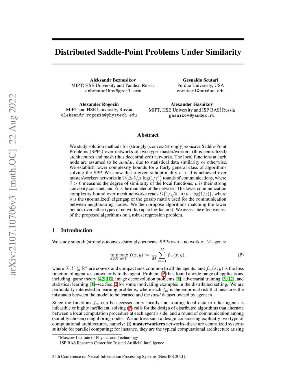 We study solution methods for (strongly-)convex-(strongly)-concave Saddle-Point Problems (SPPs) over networks of two type - master/workers (thus centralized) architectures and meshed (thus decentralized) networks. The local functions at each node are assumed to be similar, due to statistical data similarity or otherwise. We establish lower complexity bounds for a fairly general class of algorithms solving the SPP. We show that a given suboptimality is achieved over master/workers networks in rounds of communications, where measures the degree of similarity of the local functions, is their strong convexity constant, and is the diameter of the network. The lower communication complexity bound over meshed networks reads , where is the (normalized) eigengap of the gossip matrix used for the communication between neighbouring nodes. We then propose algorithms matching the lower bounds over either types of networks (up to log-factors). We assess the effectiveness of the proposed algorithms on a robust logistic regression problem.