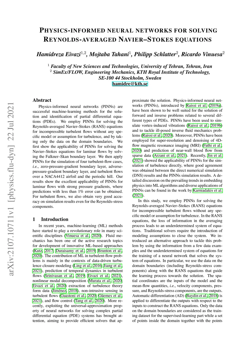 Physics-informed neural networks (PINNs) are successful machine-learning methods for the solution and identification of partial differential equations (PDEs). We employ PINNs for solving the Reynolds-averaged NavierStokes (RANS) equations for incompressible turbulent flows without any specific model or assumption for turbulence, and by taking only the data on the domain boundaries. We first show the applicability of PINNs for solving the NavierStokes equations for laminar flows by solving the FalknerSkan boundary layer. We then apply PINNs for the simulation of four turbulent-flow cases, i.e., zero-pressure-gradient boundary layer, adverse-pressure-gradient boundary layer, and turbulent flows over a NACA4412 airfoil and the periodic hill. Our results show the excellent applicability of PINNs for laminar flows with strong pressure gradients, where predictions with less than 1% error can be obtained. For turbulent flows, we also obtain very good accuracy on simulation results even for the Reynolds-stress components.