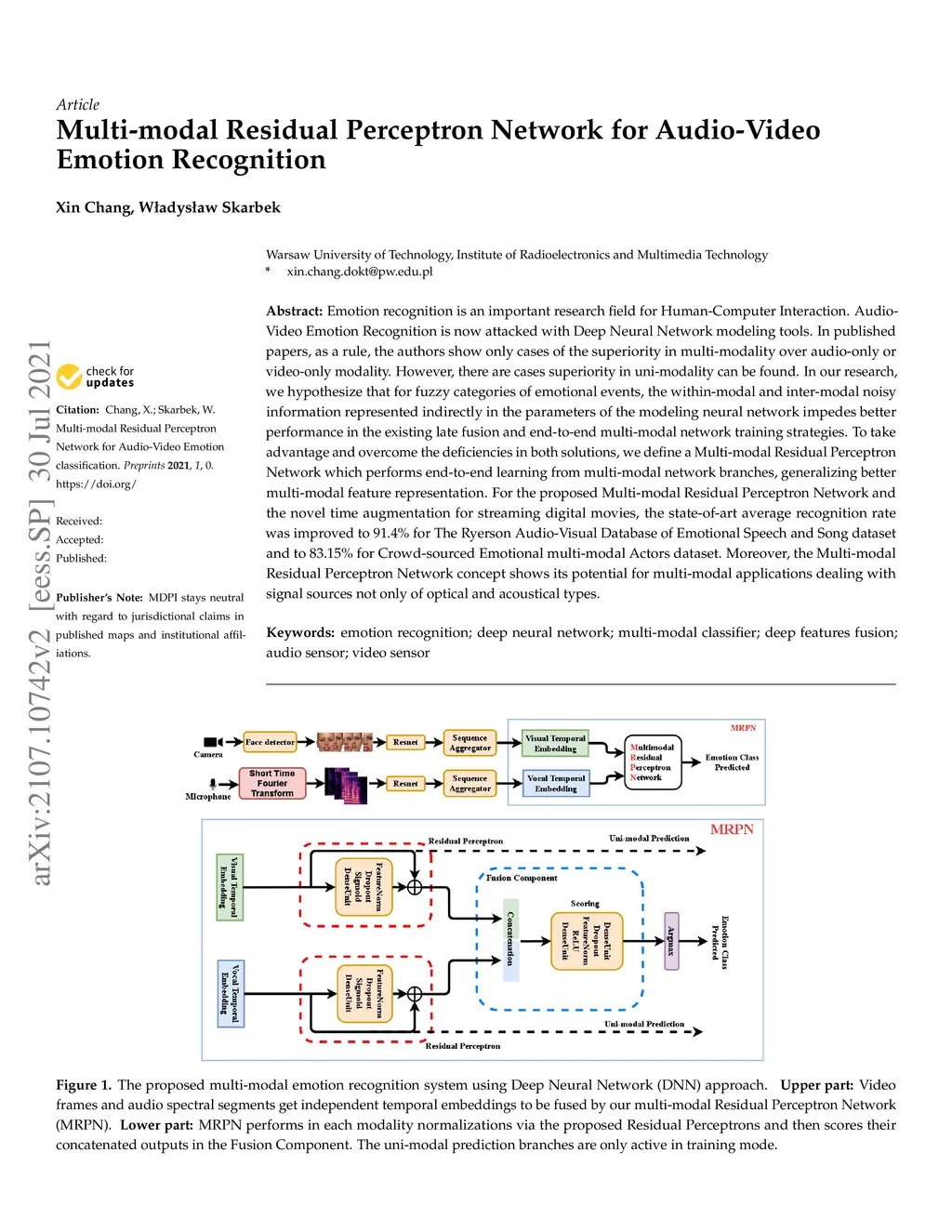 Audio-Video Emotion Recognition is now attacked with Deep Neural Network modeling tools. In published papers, as a rule, the authors show only cases of the superiority in multi-modality over audio-only or video-only modality. However, there are cases superiority in uni-modality can be found. In our research, we hypothesize that for fuzzy categories of emotional events, the within-modal and inter-modal noisy information represented indirectly in the parameters of the modeling neural network impedes better performance in the existing late fusion and end-to-end multi-modal network training strategies. To take advantage and overcome the deficiencies in both solutions, we define a Multi-modal Residual Perceptron Network which performs end-to-end learning from multi-modal network branches, generalizing better multi-modal feature representation. For the proposed Multi-modal Residual Perceptron Network and the novel time augmentation for streaming digital movies, the state-of-art average recognition rate was improved to 91.4% for The Ryerson Audio-Visual Database of Emotional Speech and Song dataset and to 83.15% for Crowd-sourced Emotional multi-modal Actors dataset. Moreover, the Multi-modal Residual Perceptron Network concept shows its potential for multi-modal applications dealing with signal sources not only of optical and acoustical types.