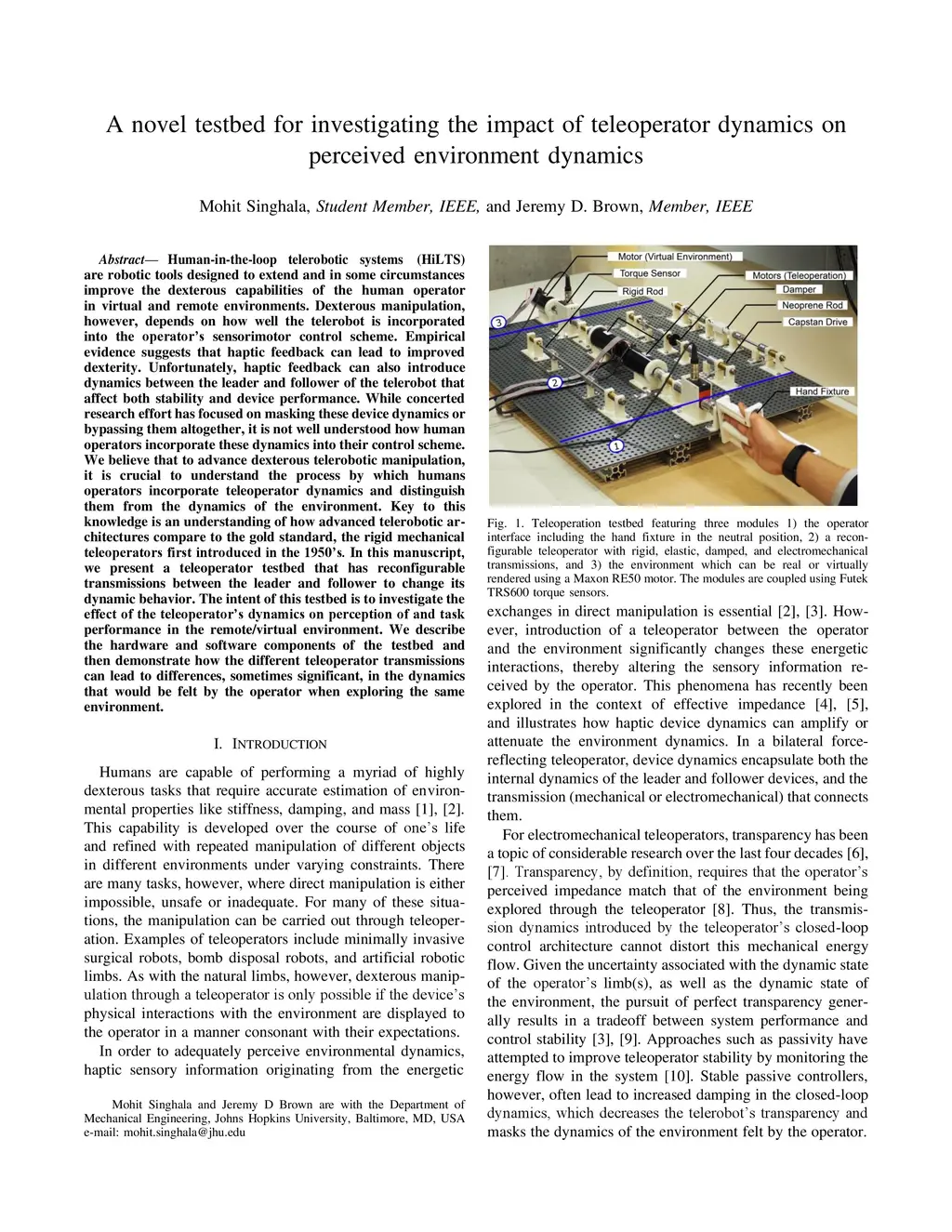A novel testbed for investigating the impact of teleoperator dynamics on