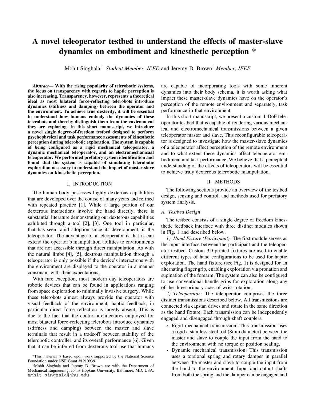 A novel teleoperator testbed to understand the effects of master-slave