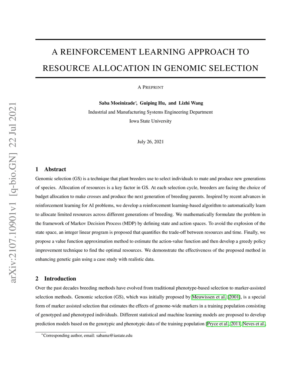 Genomic selection (GS) is a technique that plant breeders use to select individuals to mate and produce new generations of species. Allocation of resources is a key factor in GS. At each selection cycle, breeders are facing the choice of budget allocation to make crosses and produce the next generation of breeding parents. Inspired by recent advances in reinforcement learning for AI problems, we develop a reinforcement learning-based algorithm to automatically learn to allocate limited resources across different generations of breeding. We mathematically formulate the problem in the framework of Markov Decision Process (MDP) by defining state and action spaces. To avoid the explosion of the state space, an integer linear program is proposed that quantifies the trade-off between resources and time. Finally, we propose a value function approximation method to estimate the action-value function and then develop a greedy policy improvement technique to find the optimal resources. We demonstrate the effectiveness of the proposed method in enhancing genetic gain using a case study with realistic data.
