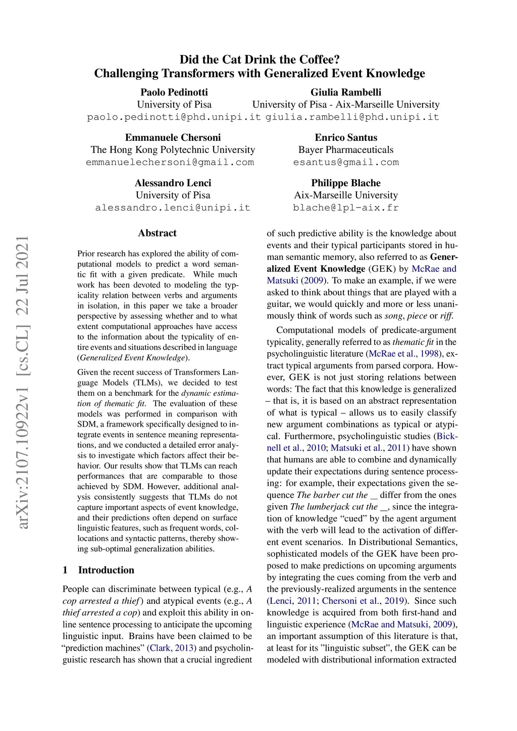 Prior research has explored the ability of computational models to predict a word semantic fit with a given predicate. While much work has been devoted to modeling the typicality relation between verbs and arguments in isolation, in this paper we take a broader perspective by assessing whether and to what extent computational approaches have access to the information about the typicality of entire events and situations described in language (Generalized Event Knowledge). Given the recent success of Transformers Language Models (TLMs), we decided to test them on a benchmark for the \textit{dynamic estimation of thematic fit}. The evaluation of these models was performed in comparison with SDM, a framework specifically designed to integrate events in sentence meaning representations, and we conducted a detailed error analysis to investigate which factors affect their behavior. Our results show that TLMs can reach performances that are comparable to those achieved by SDM. However, additional analysis consistently suggests that TLMs do not capture important aspects of event knowledge, and their predictions often depend on surface linguistic features, such as frequent words, collocations and syntactic patterns, thereby showing sub-optimal generalization abilities.