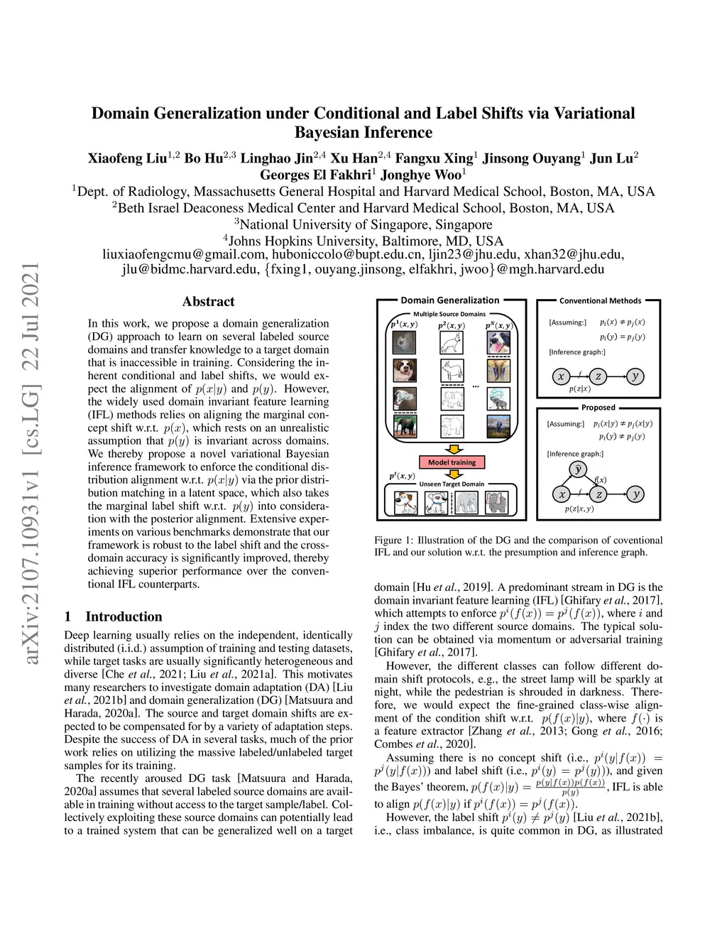 In this work, we propose a domain generalization (DG) approach to learn on several labeled source domains and transfer knowledge to a target domain that is inaccessible in training. Considering the inherent conditional and label shifts, we would expect the alignment of and . However, the widely used domain invariant feature learning (IFL) methods relies on aligning the marginal concept shift w.r.t. , which rests on an unrealistic assumption that is invariant across domains. We thereby propose a novel variational Bayesian inference framework to enforce the conditional distribution alignment w.r.t. via the prior distribution matching in a latent space, which also takes the marginal label shift w.r.t. into consideration with the posterior alignment. Extensive experiments on various benchmarks demonstrate that our framework is robust to the label shift and the cross-domain accuracy is significantly improved, thereby achieving superior performance over the conventional IFL counterparts.