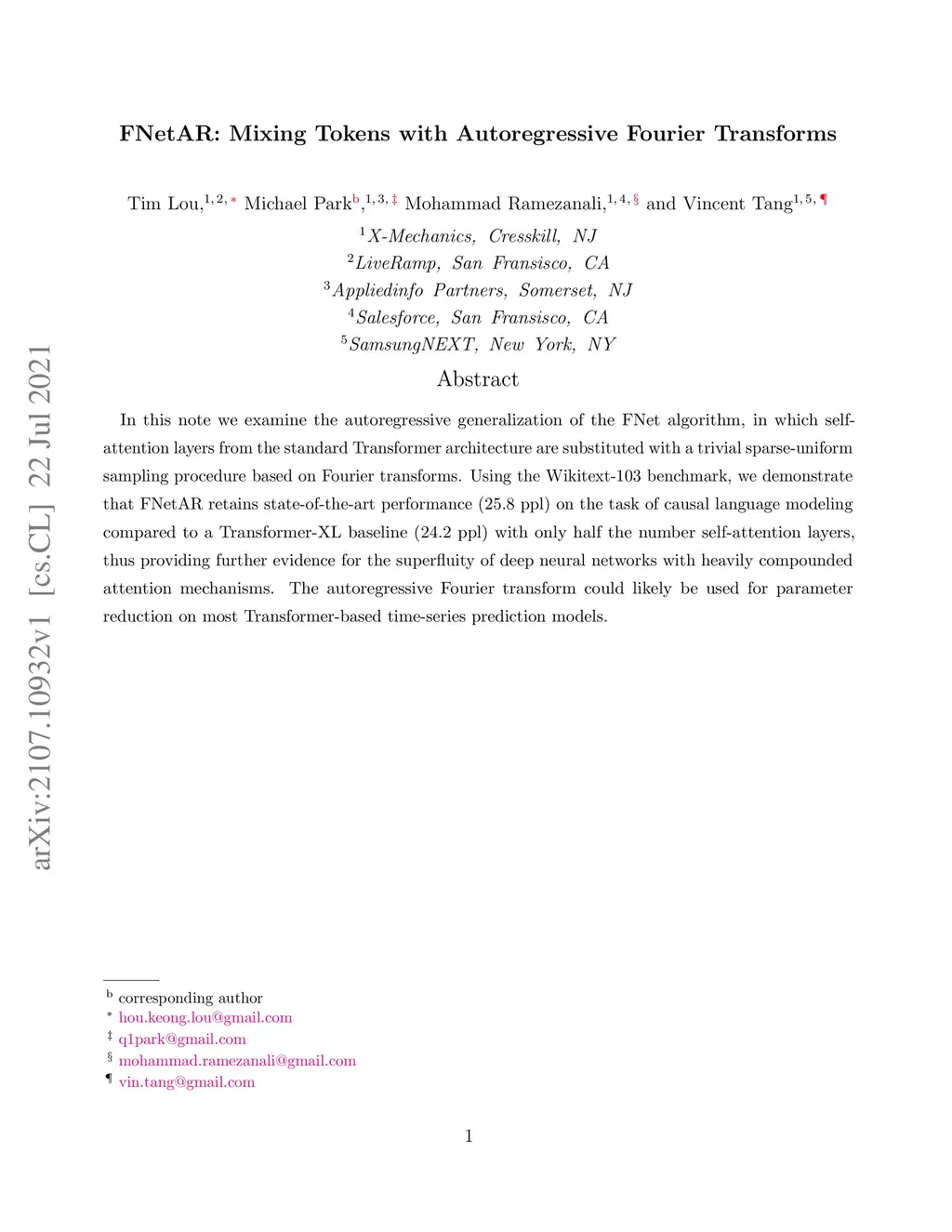 In this note we examine the autoregressive generalization of the FNet algorithm, in which self-attention layers from the standard Transformer architecture are substituted with a trivial sparse-uniformsampling procedure based on Fourier transforms. Using the Wikitext-103 benchmark, we demonstratethat FNetAR retains state-of-the-art performance (25.8 ppl) on the task of causal language modelingcompared to a Transformer-XL baseline (24.2 ppl) with only half the number self-attention layers,thus providing further evidence for the superfluity of deep neural networks with heavily compoundedattention mechanisms. The autoregressive Fourier transform could likely be used for parameterreduction on most Transformer-based time-series prediction models.