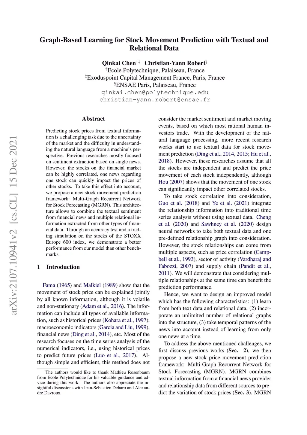 Predicting stock prices from textual information is a challenging task due to the uncertainty of the market and the difficulty understanding the natural language from a machine's perspective. Previous researches focus mostly on sentiment extraction based on single news. However, the stocks on the financial market can be highly correlated, one news regarding one stock can quickly impact the prices of other stocks. To take this effect into account, we propose a new stock movement prediction framework: Multi-Graph Recurrent Network for Stock Forecasting (MGRN). This architecture allows to combine the textual sentiment from financial news and multiple relational information extracted from other financial data. Through an accuracy test and a trading simulation on the stocks in the STOXX Europe 600 index, we demonstrate a better performance from our model than other benchmarks.