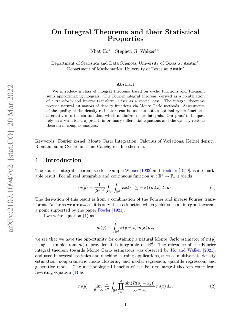 We introduce a class of integral theorems based on cyclic functions and Riemann sums approximating integrals. The Fourier integral theorem, derived as a combination of a transform and inverse transform, arises as a special case. The integral theorems provide natural estimators of density functions via Monte Carlo methods. Assessments of the quality of the density estimators can be used to obtain optimal cyclic functions, alternatives to the sin function, which minimize square integrals. Our proof techniques rely on a variational approach in ordinary differential equations and the Cauchy residue theorem in complex analysis.