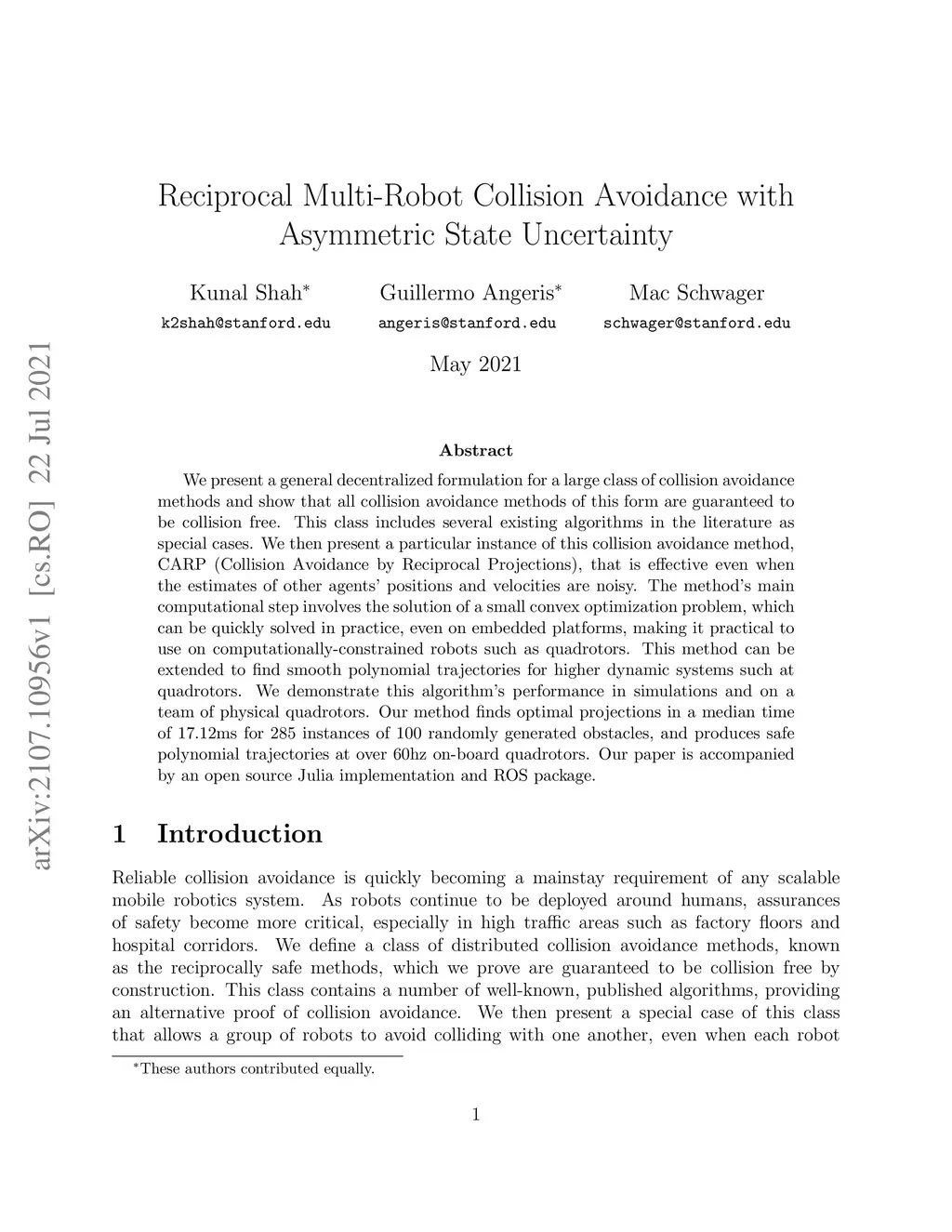 We present a general decentralized formulation for a large class of collision avoidance methods and show that all collision avoidance methods of this form are guaranteed to be collision free. This class includes several existing algorithms in the literature as special cases. We then present a particular instance of this collision avoidance method, CARP (Collision Avoidance by Reciprocal Projections), that is effective even when the estimates of other agents' positions and velocities are noisy. The method's main computational step involves the solution of a small convex optimization problem, which can be quickly solved in practice, even on embedded platforms, making it practical to use on computationally-constrained robots such as quadrotors. This method can be extended to find smooth polynomial trajectories for higher dynamic systems such at quadrotors. We demonstrate this algorithm's performance in simulations and on a team of physical quadrotors. Our method finds optimal projections in a median time of 17.12ms for 285 instances of 100 randomly generated obstacles, and produces safe polynomial trajectories at over 60hz on-board quadrotors. Our paper is accompanied by an open source Julia implementation and ROS package.